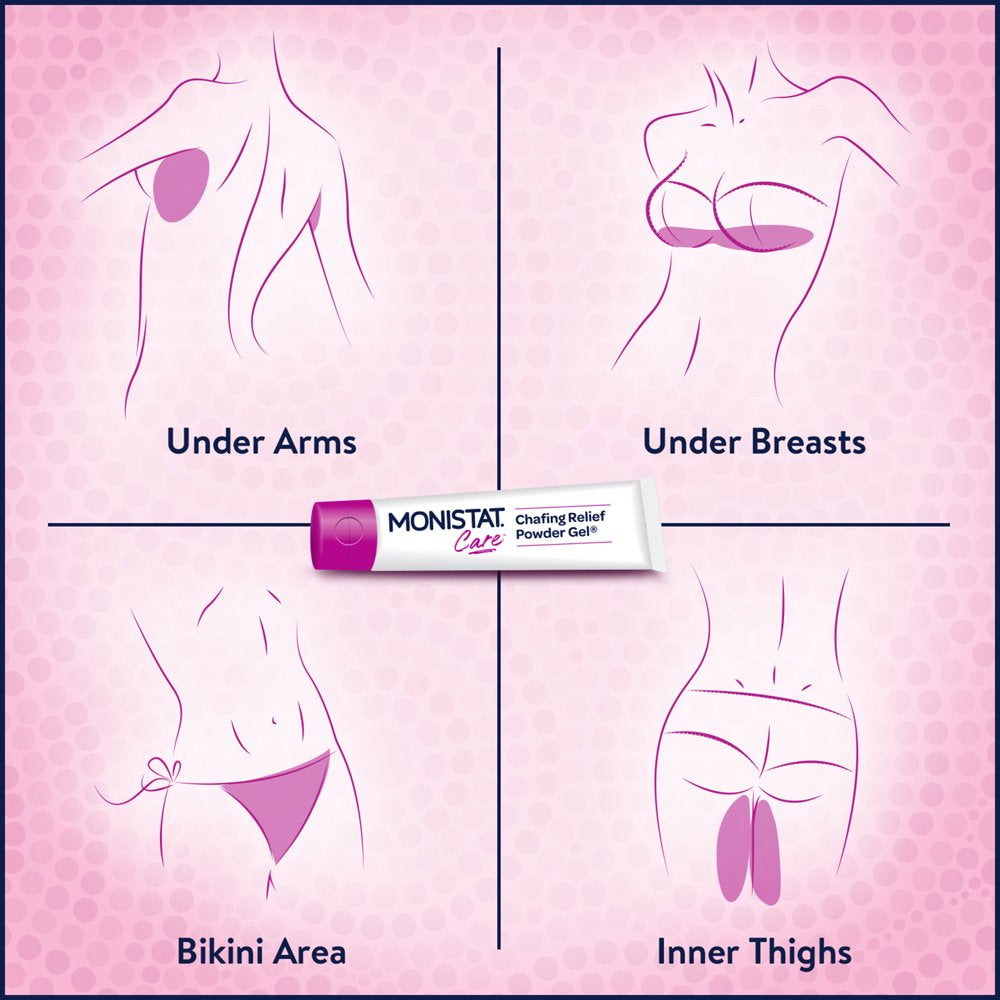- Safe to use under arms, under breasts, on the bikini area, and on inner thighs; fight chub rub and shaving irritation alike with Monistat’s soothing anti-chafing gel