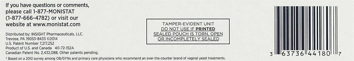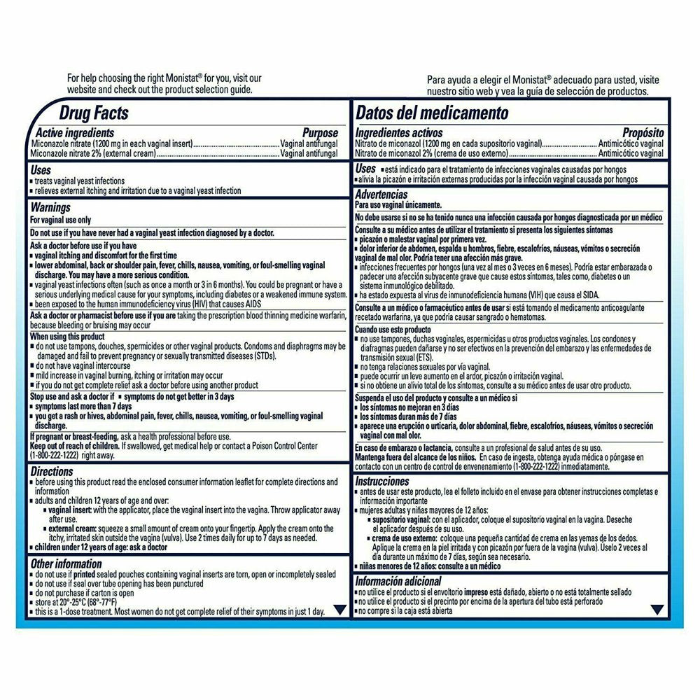 Monistat 1 is a 1-day treatment system with a Miconazole Nitrate Vaginal Insert (1200 mg) and Miconazole Nitrate Cream (2 percent) for external use. This clinically proven treatment cures most vaginal yeast infections and helps relieve the associated external itching and irritation. The pack comes with a comfortable-to-use flex applicator; insert is designed to stay in place day or night.