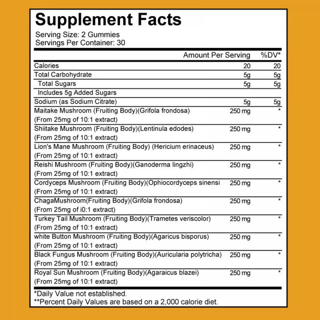 POTENT ADAPTOGEN BLEND | 10 MUSHROOMS | 2500 MG PER SERVING - Explore the amazing health benefits of mushrooms in the most delicious way! Our new mushroom gummies complex is made with lion’s mane powder, reishi powder, shiitake powder, cordyceps powder, chaga powder and many more. Loaded with health-boosting vitamins, minerals, and antioxidants, this medicinal mushroom supplement helps your body adjust to physical, chemical, biological stress and produce nerve growth factors.