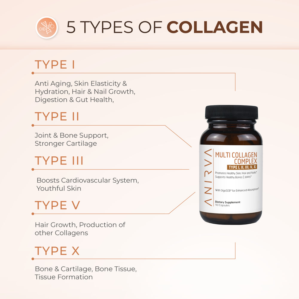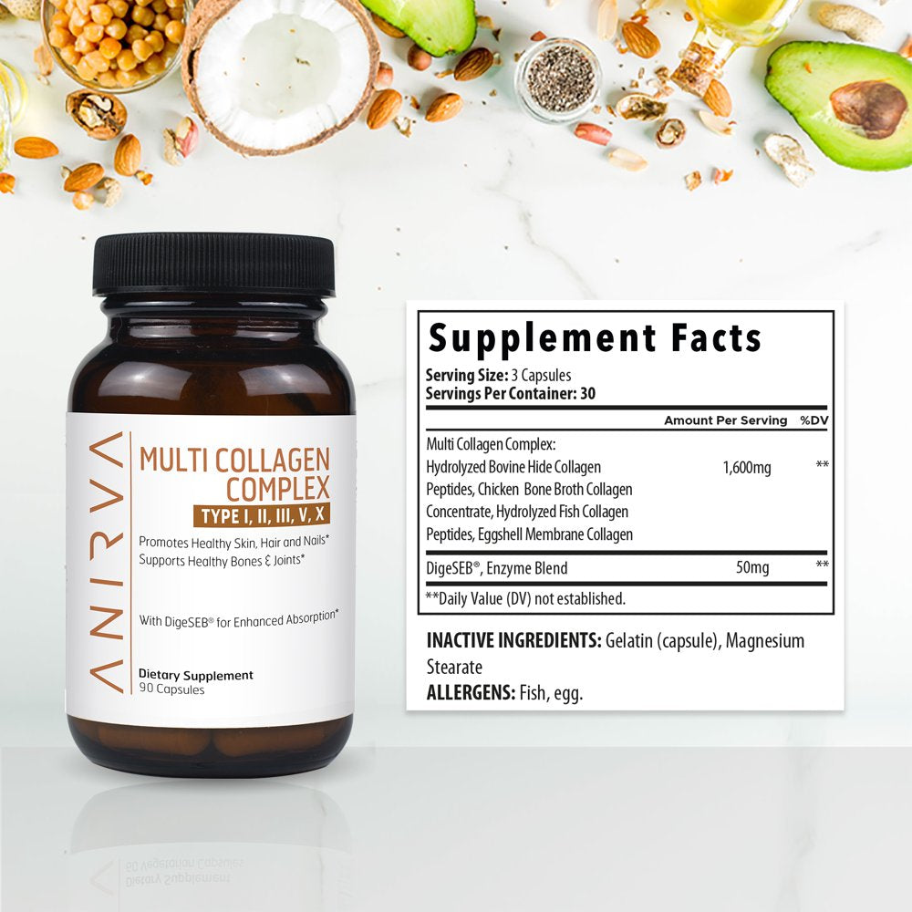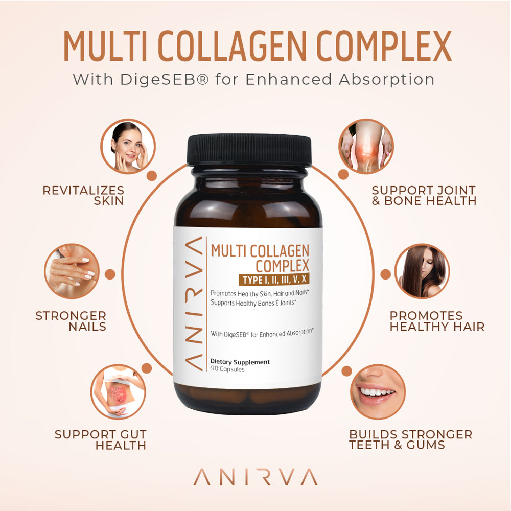 - FORMULATED TO BATTLE AGAINST AGING: Anirva’s Multi Collagen Complex supplement made up of collagen sources I, II, III, V, and X. Best collagen supplements for both women and men that Supports hair, skin, nails, joints, & gut health. Each Collagen pill contains DigeSEB for easy absorption