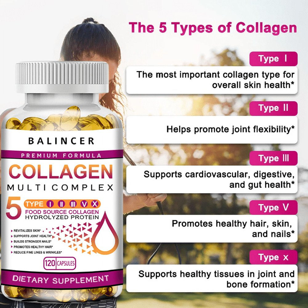 ALL-IN-ONE SUPER COLLAGEN COMPLEX - Our hydrolyzed collagen peptide pills feature a blend of 100% Grass-fed Bovine Collagen, Chicken Collagen, Eggshell and Marine Collagen sources, containing All 5 Types of Collagen - I, II, III, V & X 6 TYPES TO LOOK & FEEL YOUR BEST- Our Potent formula includes all 5 types of collagen hydrolysate for maximum benefits, including Anti-Aging, Healthier Hair, Skin and Nails. It also supports Stronger Joints and Bones while aiding in Digestion and Gut Heal n᠀ QUALITY YOU CAN TRUST: At BALINCER, we stand behind our product’s safety and quality. Our products are formulated to provide superior results and are always backed by science. Made from All-Natural Vitamins, Minerals & Herbal Extracts, without the use of harmful additives, NON-GMO and FREE of hormones.
