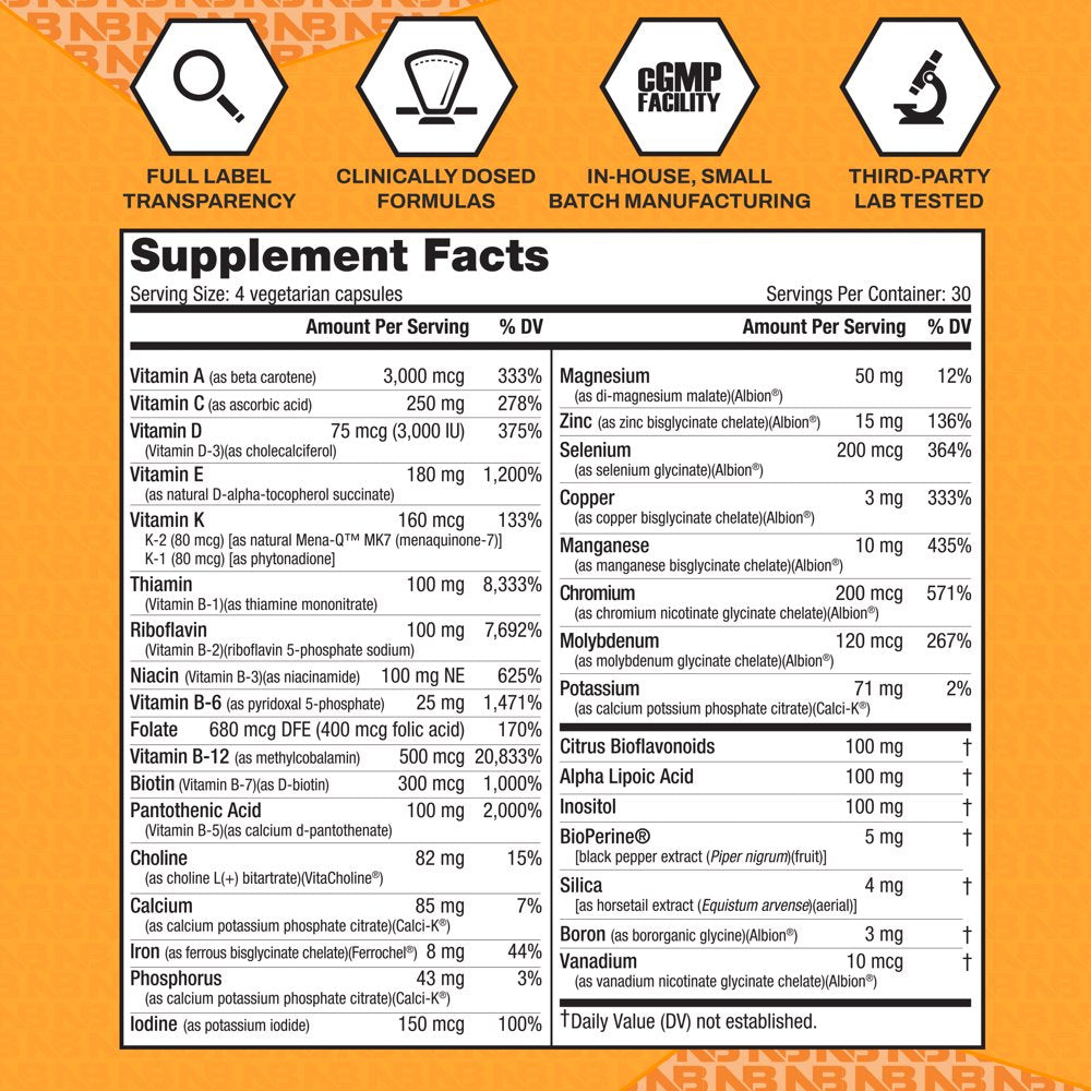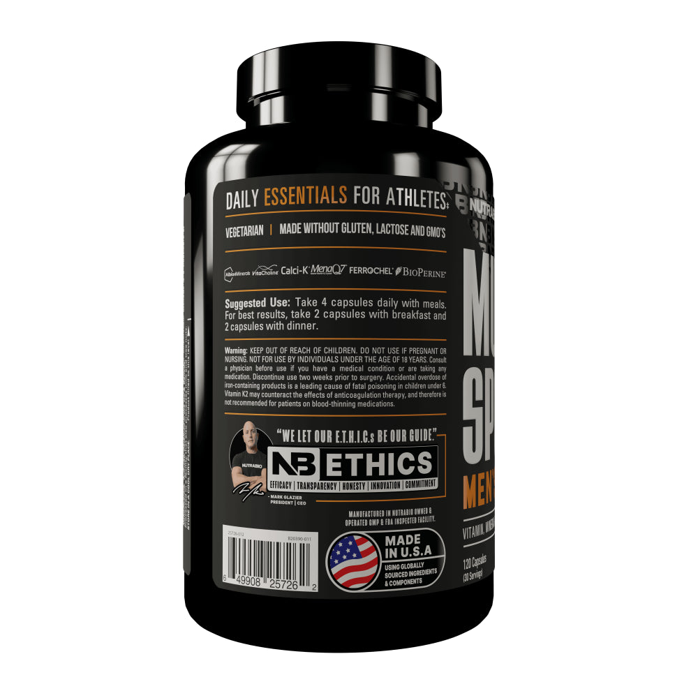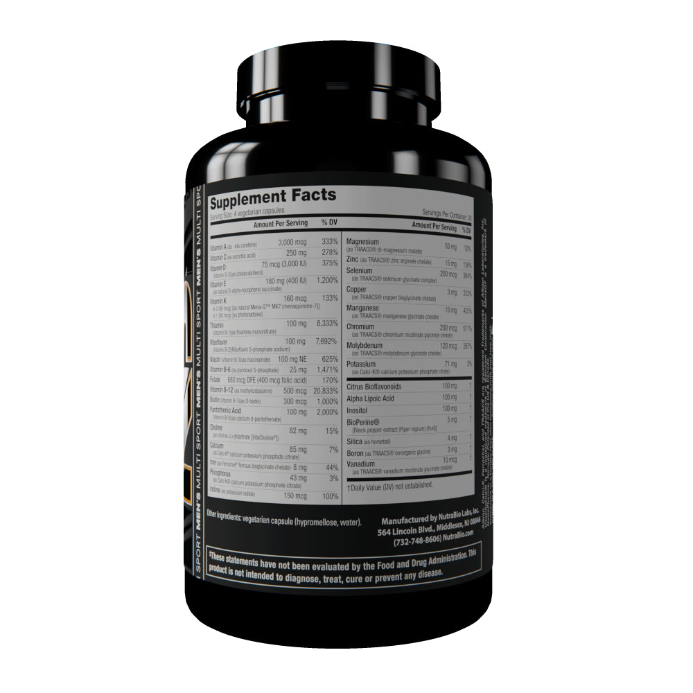 Multisport Men'S Daily Multivitamin-Mineral Supplement, Vitamin C, D, E, MK7, Zinc for Immune Support, 120 Vegetable Capsules, Nutrabio Labs
