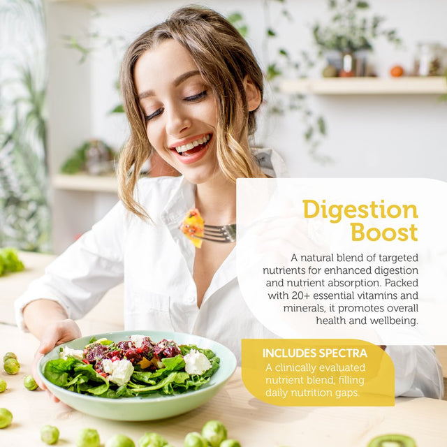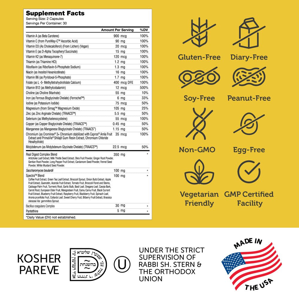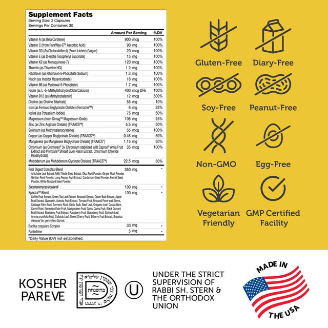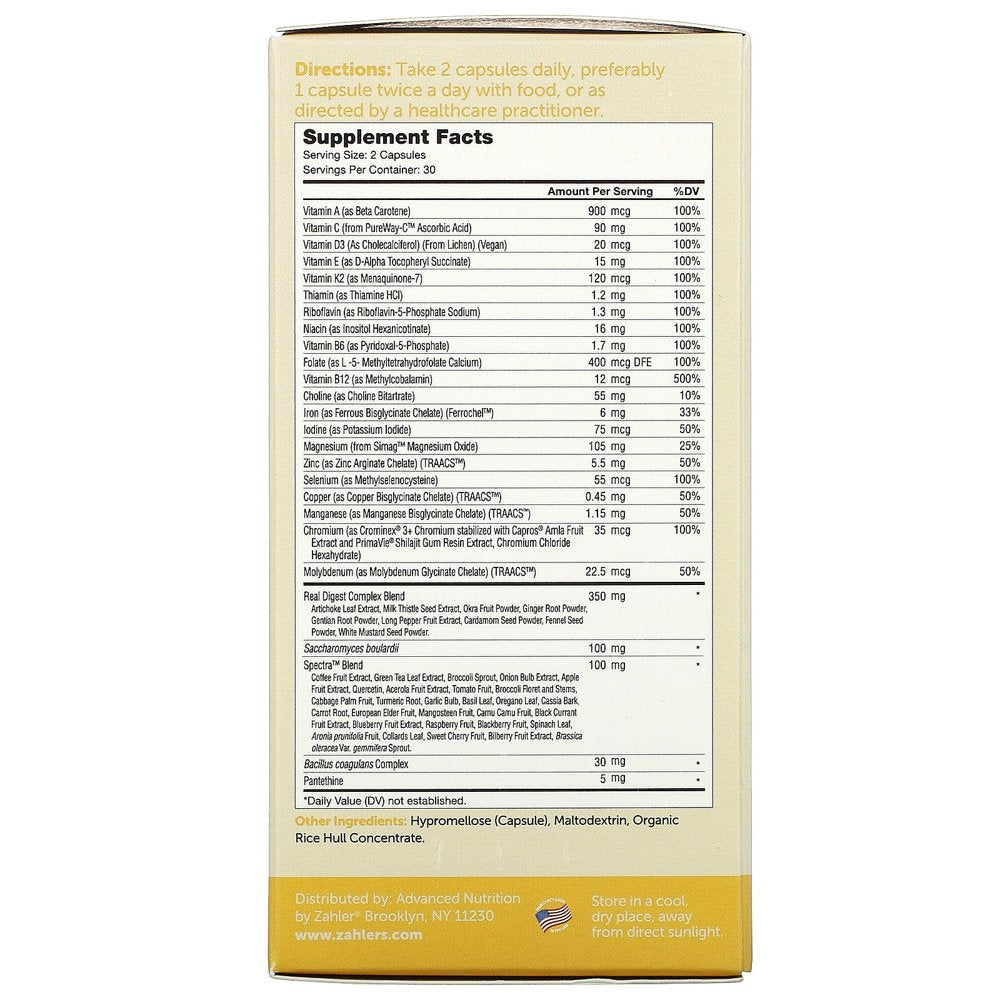 Advanced Nutrition by Zahler� Nutrient-Loaded Whole Food Fruit & Veggie Base Targeted Multis Dietary Supplement Non-GMO Gluten-Free Dairy Free Soy Free Vegan Friendly Kosher Pareve GMP Certified Facility Multi Digestion Benefits Superior Nutrition from Superior Sources Provides a body-ready and bioactive complex of vitamins & minerals (includes methylated, phosphorylated, chelated & coenzyme forms) for maximum absorption & activity. Spectra? - Wholefood Fruit & Veggie Complex Spectra? is a scientifically created, clinically studied & published, phytonutrient-loaded blend of 29 plant extracts that support cellular health and antioxidant action. Digestive Support from Probiotics + a Digestive Botanical Complex These potent ingredients support overall gut health, healthy digestion and balanced intestinal flora. Feel Better, Everyday? In addition to providing a complete body-ready and bioactive multinutrient formula with Spectra?, Multi-Digestion features two shelf-stable and robust probiotic strains, Bacillus coagulans and Saccharomyces boulardii, which support flora balance. Also included is Real Digest Complex, which soothes and stimulates digestive function as well as supports and promotes. Digestive function and nutrient absorption Intestinal flora and balance Healthy elimination without laxative compounds