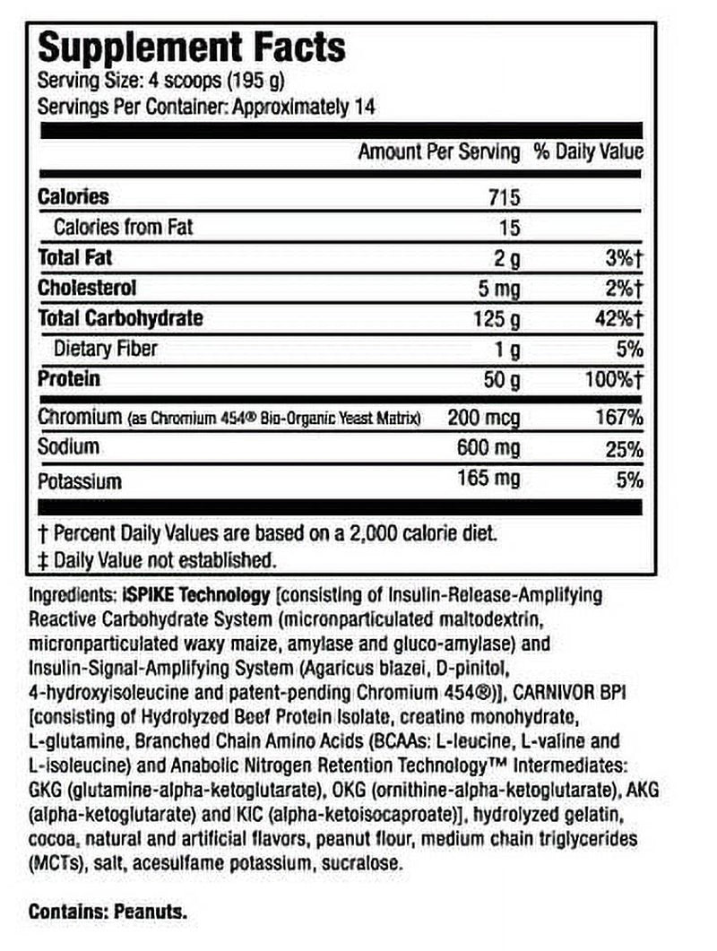 The days of loading your body with empty fat storing calories are over. Calories don't stimulate muscle growth - anabolism does. Welcome to a new era in mass building supplementation with CARNIVOR MASS, the fast, clean and highly anabolic mass gainer. High-speed macronutrient delivery with near-perfect insulin optimization setsCARNIVOR MASS apart from all others. As the pros know, fast proteins combined with elevated insulin equals explosive muscle anabolism (growth). This is finally possible with MuscleMeds world famous Beef Protein Isolate (BPI) acting in combination with iSpike, a dual insulin release/insulin signal amplifying technology not found in any other supplement made today. Beef Protein Isolate: Beef has proven itself as a favorite anabolic protein source for many champion bodybuilders. MuscleMeds advanced hydrolyzed Beef Protein Isolate is capable of delivering rapid absorption of high concentrations of amino acids fast. CARNIVOR MASS provides the mass building benefits of