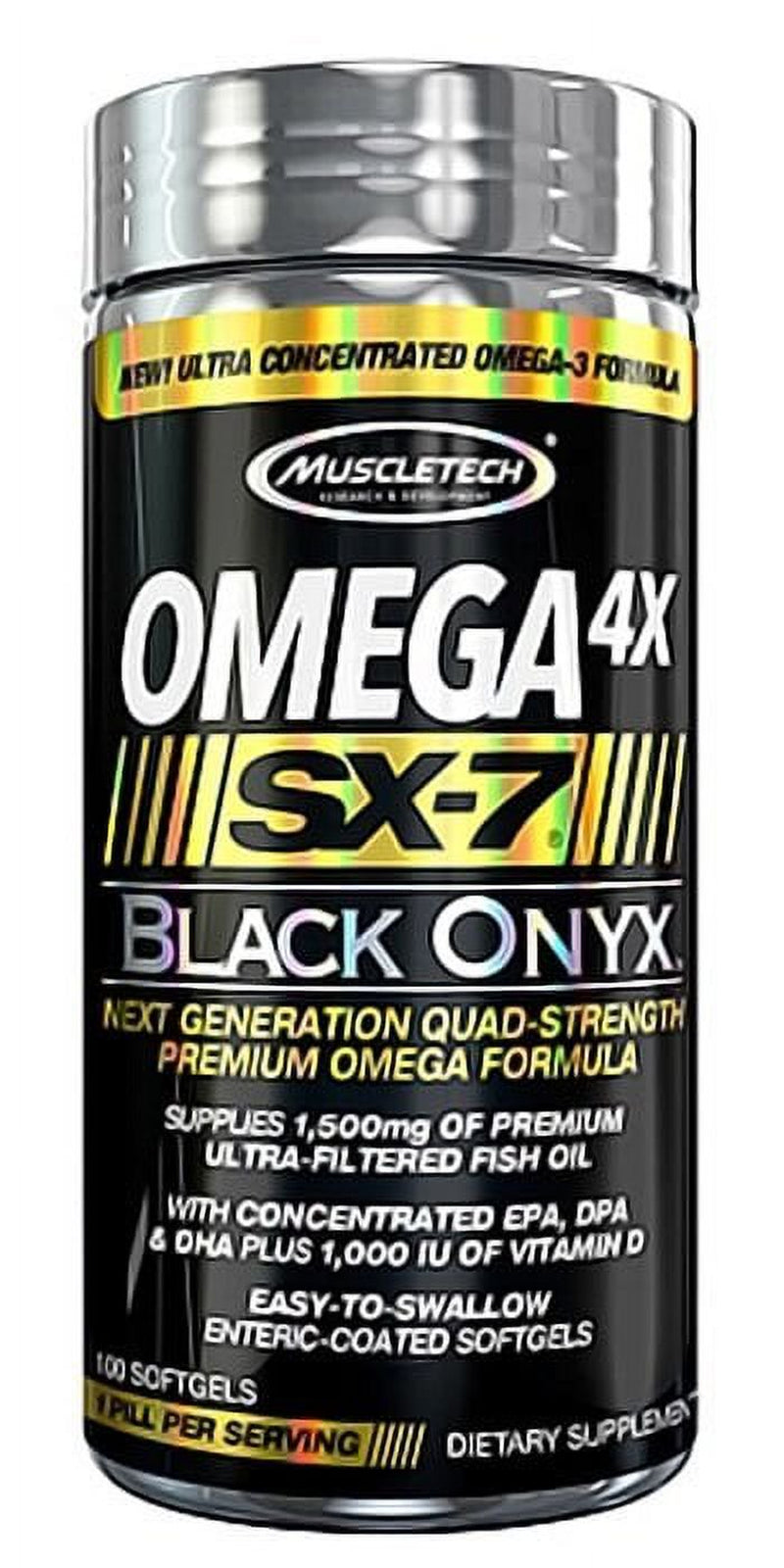 Muscletech Products - Omega 4X SX-7 Black Onyx - 100 Softgels Muscletech Products Omega 4X SX-7 Black Onyx is an advanced, ultra-pure and high-potency fish oil formula designed specifically for hardcore athletes. With 1,500mg of fish oil in each serving, Omega 4X SX-7 Black Onyx supplies 1,200mg of omega-3 fatty acids - that's an 80% concentration, one of the highest potencies available. Each capsule delivers an incredible four times the omega-3 fatty acids of regular fish oil products. This includes high doses of the key omega-3 fatty acids docosahexaenoic acid (DHA) and eicosapentaenoic acid (EPA). Supplies 1,500mg of premium ultra-filtered fish oil With concentrated EPA, DPA & DHA, plus 1,000 IU Of vitamin D Easy-to-swallow, enteric-coated softgels Ultra Concentrated Omega-3 Formula We spend countless hours debating the merits of various pre-workouts, proteins, recovery products and pills – and many of us are on a continuous quest to discover and try the next