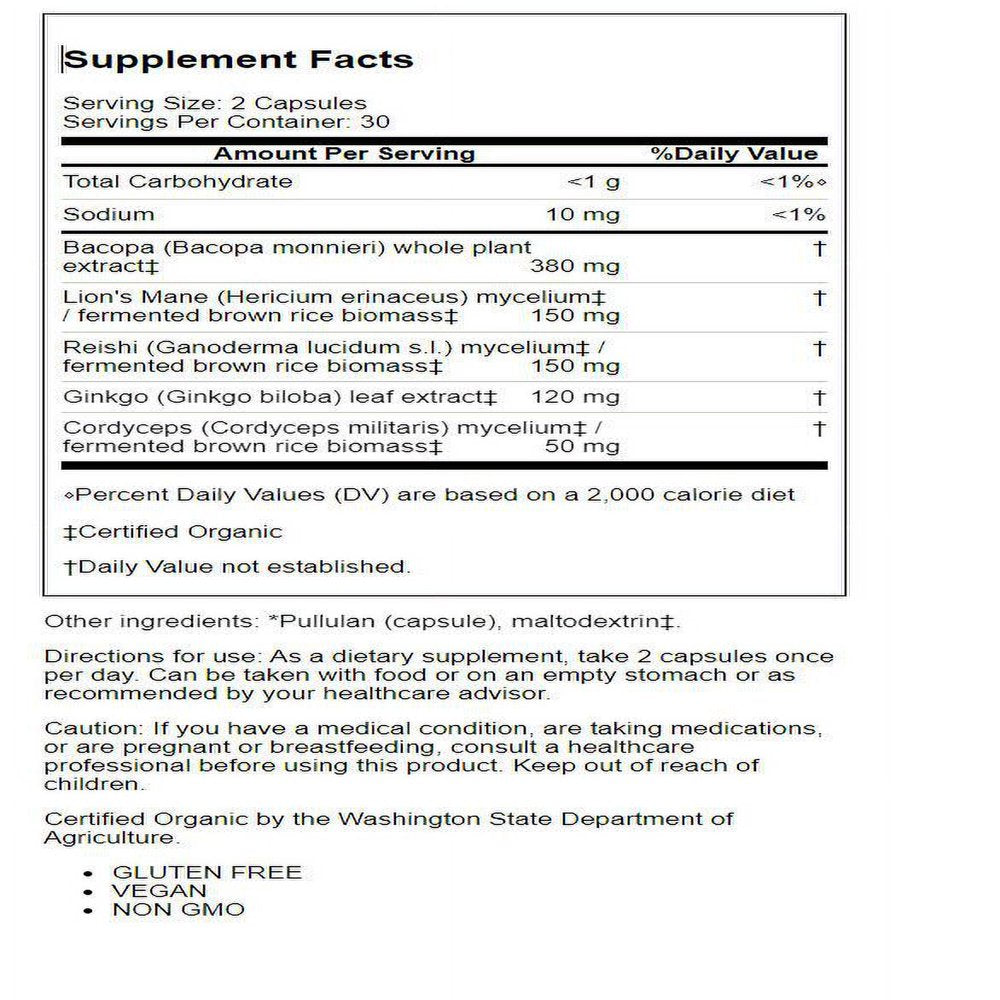 - HERBAL POWER: Certified organic herbs are selected to complement the health benefits of mushrooms; Ginkgo, Bacopa and Gotu Kola extract for brain support