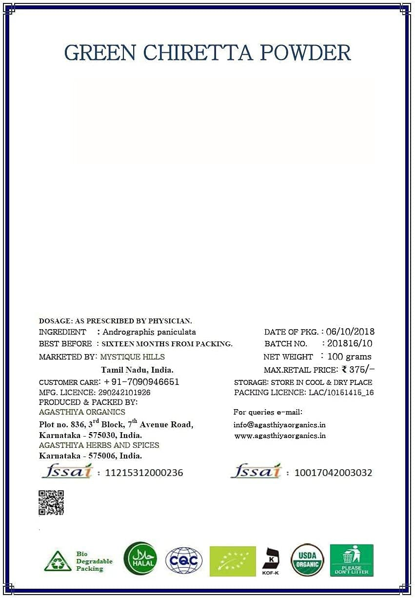 Mystique Hills Organic Green Chiretta Powder (Andrographis Paniculata) Premium Quantity (100 G)