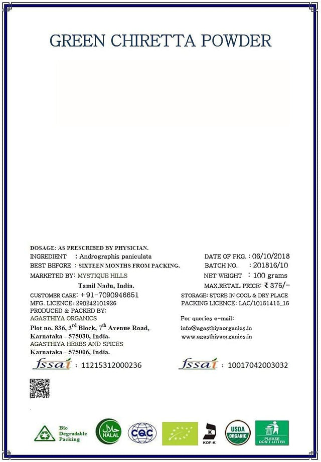 Mystique Hills Organic Green Chiretta Powder (Andrographis Paniculata) Premium Quantity (100 G) is backordered and will ship as soon as it is back in stock.