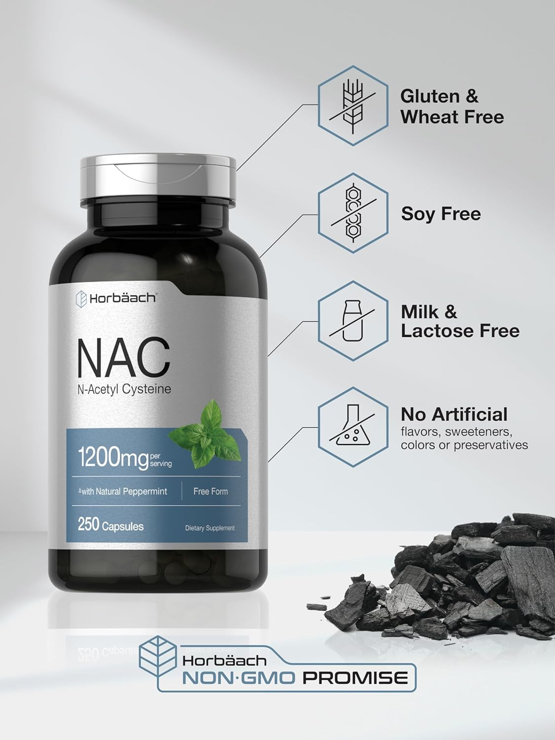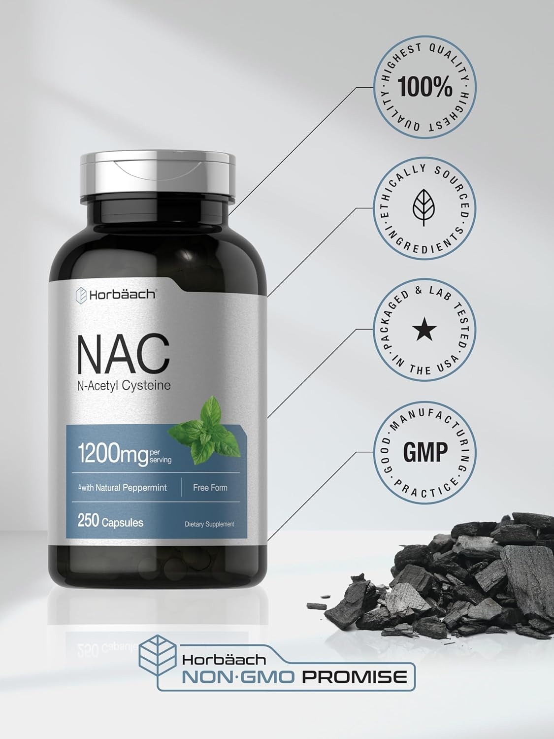 NAC N-Acetyl Cysteine Supplement 1200Mg | 250 Capsules | with Natural Peppermint | Non-Gmo, Gluten Free | by Horbaach is backordered and will ship as soon as it is back in stock.