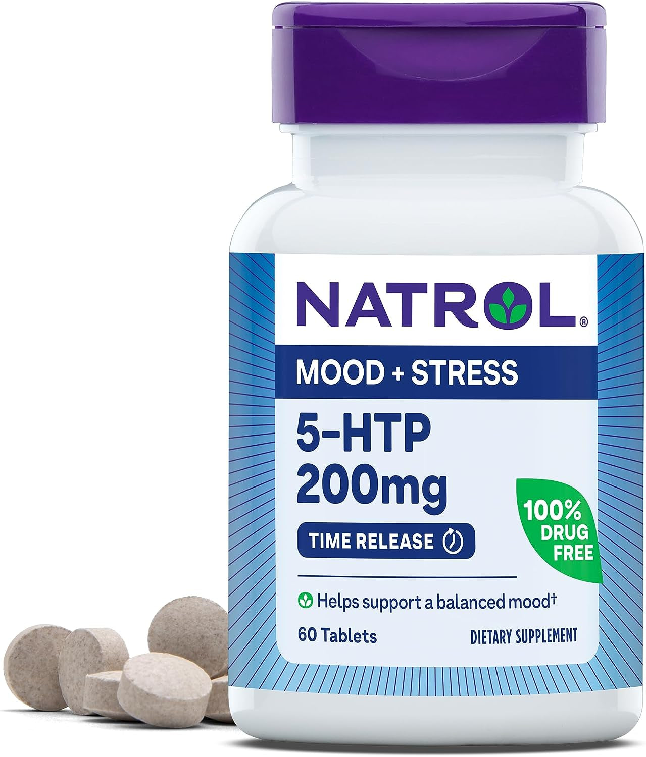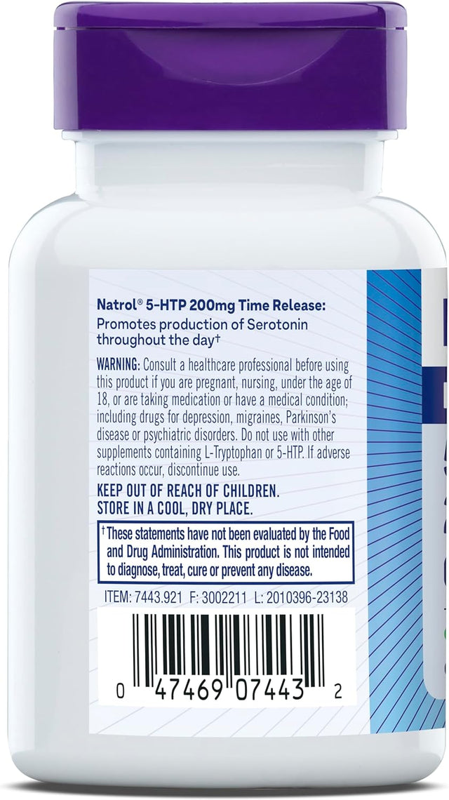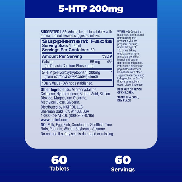 Natrol 5-HTP helps support a balanced mood and promotes production of serotonin throughout the day.* Sourced from high-quality ingredients, this vegetarian dietary supplement contains no milk, egg, fish, crustacean shellfish, tree nuts, peanuts, wheat, soybeans or sesame. 5-HTP (5-Hydroxytryptophan) is an amino acid that promotes the production of serotonin throughout the day.* With 200mg of 5-HTP per serving, this Natrol supplement offers a 100% drug-free helps support a balanced mood.* Each Natrol 5-HTP tablet is designed to gradually release 5-HTP to help you throughout the day.* Adults, take one tablet one time daily with a meal. Natrol is the #1 5-HTP brand in America and one of the nation's leading manufacturers of vitamins and supplements. (1)(1) Nielsen, xAOC, 52 weeks ending 7/1/23, 5-HTP