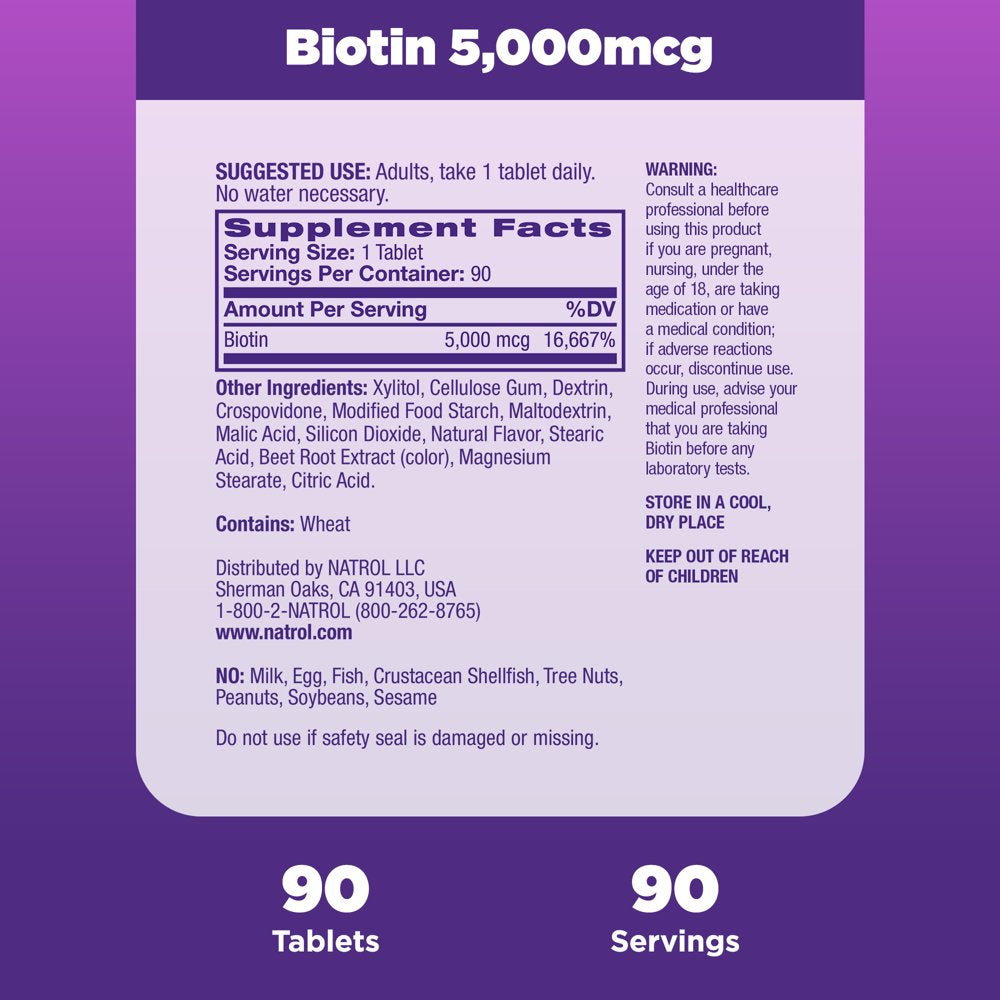 Biotin has as many benefits as it does names. This B vitamin, also known as vitamin H or vitamin B7, helps support metabolism, assists in the conversion of food into energy and supports healthy hair, skin and nails for those low in biotin.* Natrol Biotin's unique fast dissolve formula enables fast absorption to help deliver those benefits as quickly as possible.* This daily supplement has a tasty strawberry flavor and can be taken anytime, anywhere with no water needed. *These statements have not been evaluated by the Food and Drug Administration. This product is not intended to diagnose, treat, cure or prevent any diseases.