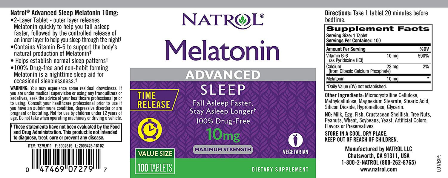 Melatonin serves as the body's biological clock, managing the sleep and wake cycles. Age, everyday stress and diet choices induced by busy lifestyles can take a toll on the body's production of melatonin. Natrol Melatonin is a nighttime sleep aid that assists with occasional sleeplessness. It helps to establish normal sleep patterns to give you a more restful, relaxing sleep and in turn, better overall health. Natrol Advanced Sleep Melatonin is a 2-layer controlled release tablet that releases and an initial 5mg dosage to help you fall asleep fast, and then releases the remaining 5mg over time to help you stay asleep through the night. 100% drug-free, non-habit forming, 100% vegetarian.