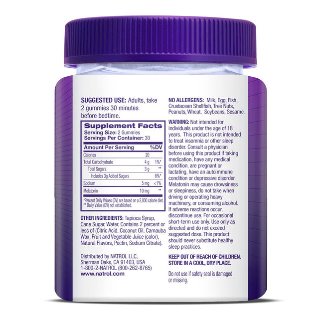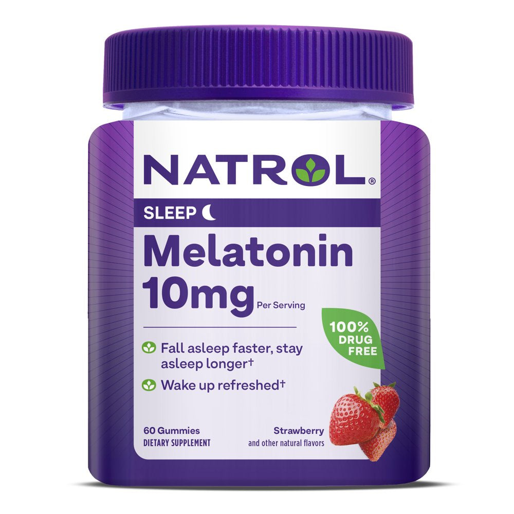 Fall asleep faster, stay asleep longer with great tasting, strawberry flavored and other natural flavors Melatonin gummy supplements.† Natrol® Melatonin Gummies are non-GMO, vegetarian and free of gluten, gelatin, synthetic dyes, artificial flavors, sweeteners and preservatives. Natrol Melatonin Gummies are pectin-based, so are less likely to stick to your teeth and to the bottle than standard gelatin gummies.
