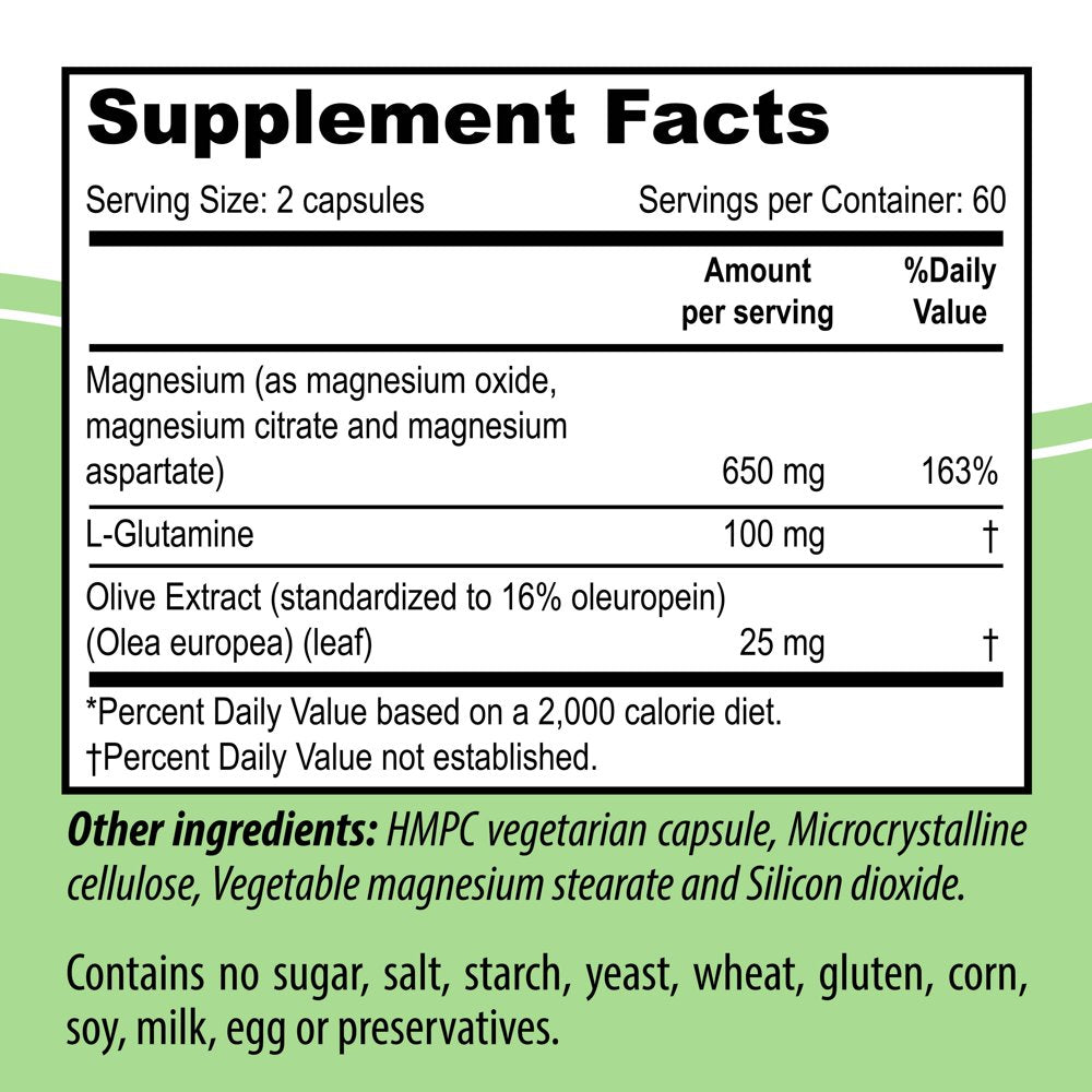Magnesium (as magnesium oxide, magnesium citrate, magnesium aspartate), Olive extract, L-Glutamine/div>