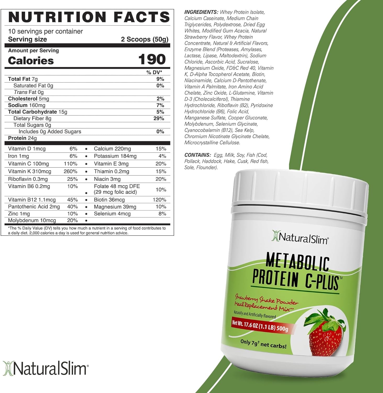 Naturalslim Strawberry Metabolic C-Plus Meal Replacement Protein Powder - Low Carb Protein Shake with Immune Support Fortified with Vitamin C, Zinc & Amino Acid - 10 Servings 17.6 Oz