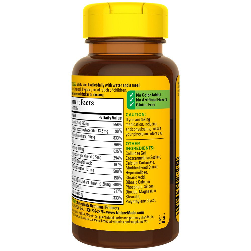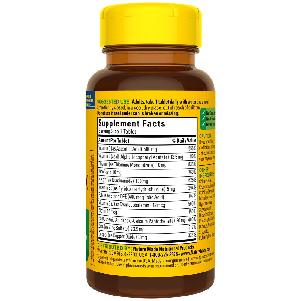 Nature Made Stress B Complex with Vitamin C and Zinc is a dietary supplement designed to help support your immune system. Sourced from high-quality ingredients, this gluten free stress supplement is made with no color added and no artificial flavors. This Vitamin B-complex supplement helps support energy metabolism(1) and provides B6, which supports the production of neurotransmitters needed for mood health. This Nature Made Stress B Complex provides all 8 essential B vitamins: thiamin (B1), riboflavin (B2), niacin (B3), pantothenic acid (B5), B6 (pyridoxine), biotin (B7), folic acid (B9), and B12 (cyanocobalamin). These Vitamin B complex immune support tablets also contain Vitamin C and E for antioxidant support, and Zinc to help support the immune system and normal growth development. Adults take one of these Nature Made Stress B-complex with Vitamin C and Zinc tablets daily with water and a meal. Nature Made supplements are quality you can trust. (1)Helps convert food into cellular enegy. *Based on a survey of pharmacists who recommend branded vitamins and supplements.CAUTION: If you are taking medication, including anticonvulsants, consult your physician before use.
