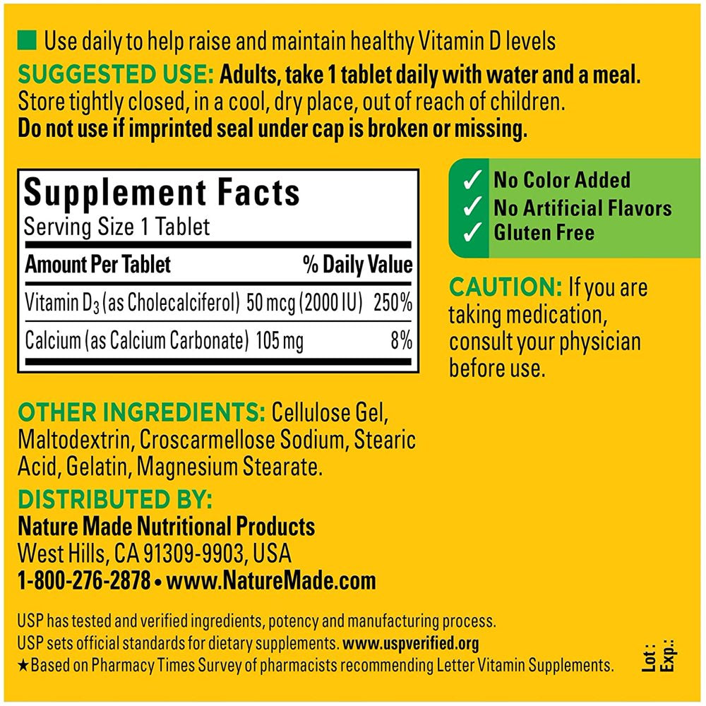 Nature Made Vitamin D3 2000 IU tablet is perfect for the adult who feels they would benefit from a higher dosage (due to low sun exposure in the winter season, heavy sunscreen usage, etc.) or has been recommended a higher dosage by their physician. Maintaining healthy levels of Vitamin D in your body has been shown to be an important part of your overall health. Nature Made® Vitamin D 2000 IU tablets are made of Vitamin D3, the bodys preferred form of Vitamin D.Ensuring healthy levels of Vitamin D in your body helps support heart health Vitamin D supplements come in two forms: Vitamin D2 and Vitamin D3; Vitamin D3 is more effective form for maintaining adequate levels of Vitamin D in the body.