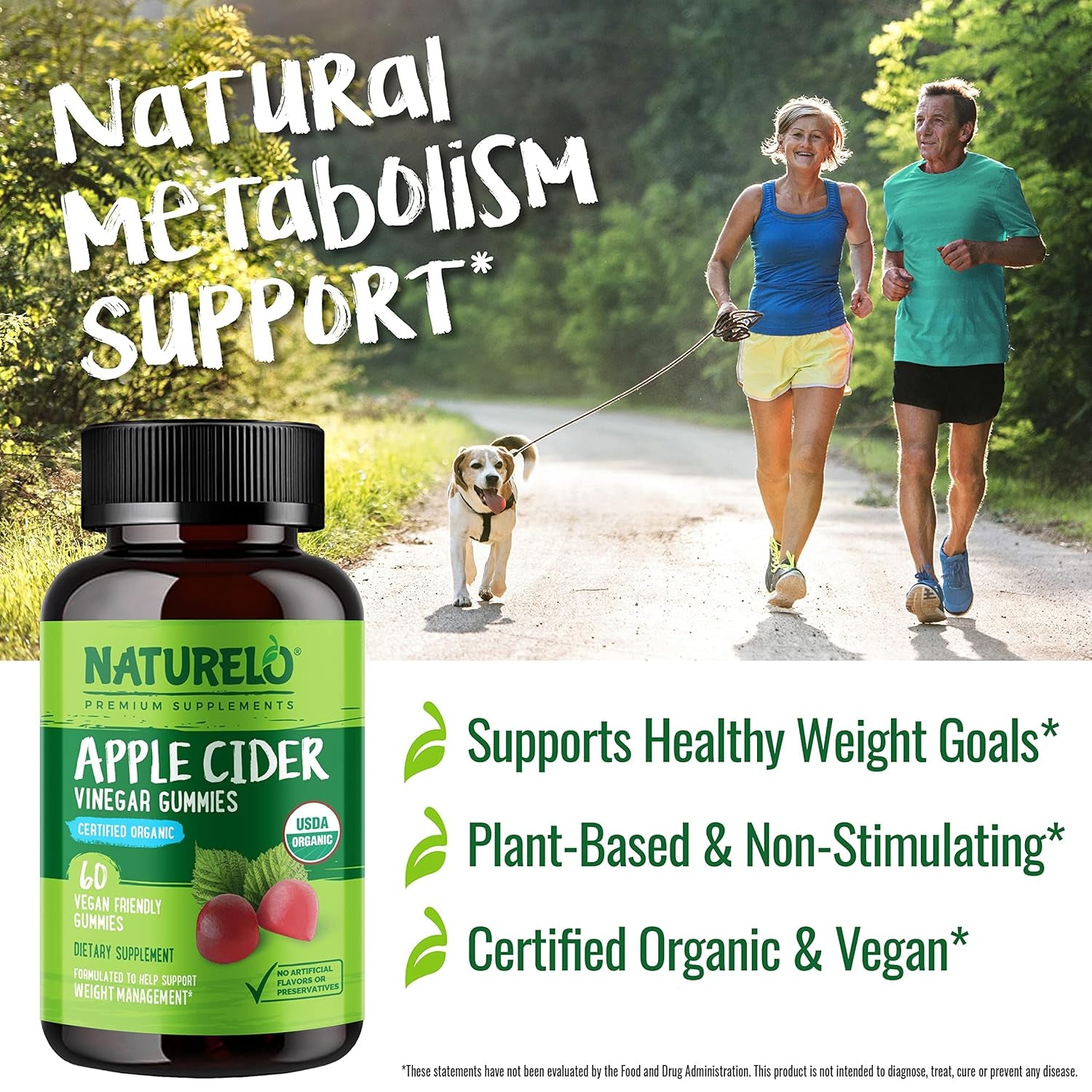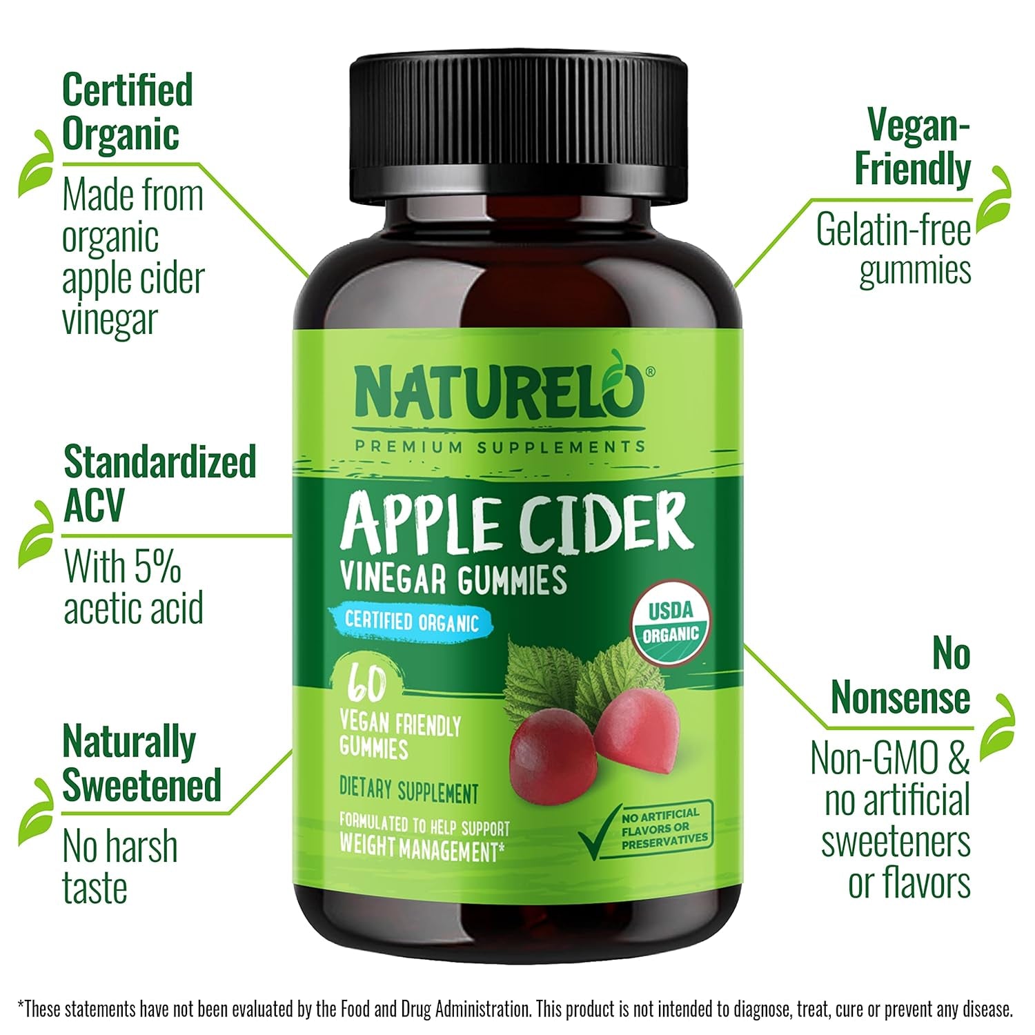 Metabolism Support, From Nature with Love For centuries, traditional health solutions were made from real food. Apple cider vinegar is one of those traditional foods. Itâs made simply from organic apple juice fermented with help from friendly bacteria to produce acetic acid. Acetic acid gives vinegar its sour taste, and is thought to be the main source of its health benefits.ÂAcetic acid has been researched for its effects on metabolism and appetite, and may help support your weight management goals when combined with a healthy diet and lifestyle.* At NATURELO, we take natureâs plant-based health solutions and turn them into premium food-based supplements that work with your body and fit easily into your modern lifestyle. Our Apple Cider Vinegar Gummies give you the benefits of apple cider vinegar without the harsh taste, in a tasty chewable gummy that goes down easy, with no artificial sweeteners or synthetic colors.ÂBetter yet, our Apple Cider Vinegar Gummies are certified organic, non-GMO, and vegan, with no artificial flavors and no gelatin. Just clean, high-quality ingredients, the way your body likes it.