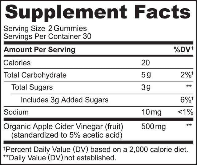 - Tasty Apple Cider Vinegar Chews: Our gummy apple cider vinegar chewables are an easy addition to your lifestyle, giving you the benefits of organic apple cider vinegar standardized to 5% acetic acid, but without the harsh acidic taste.