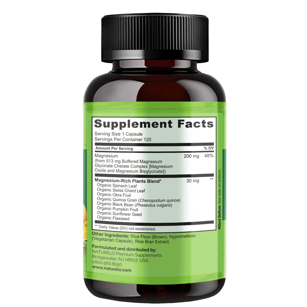 - Plant-Based Supplement: 200 mg Magnesium pl organic vegetables and seeds with naturally-occurring magnesium, including organic spinach, swiss chard, okra, quinoa, black bean, pumpkin seed, sunflower seed and flaxseed.