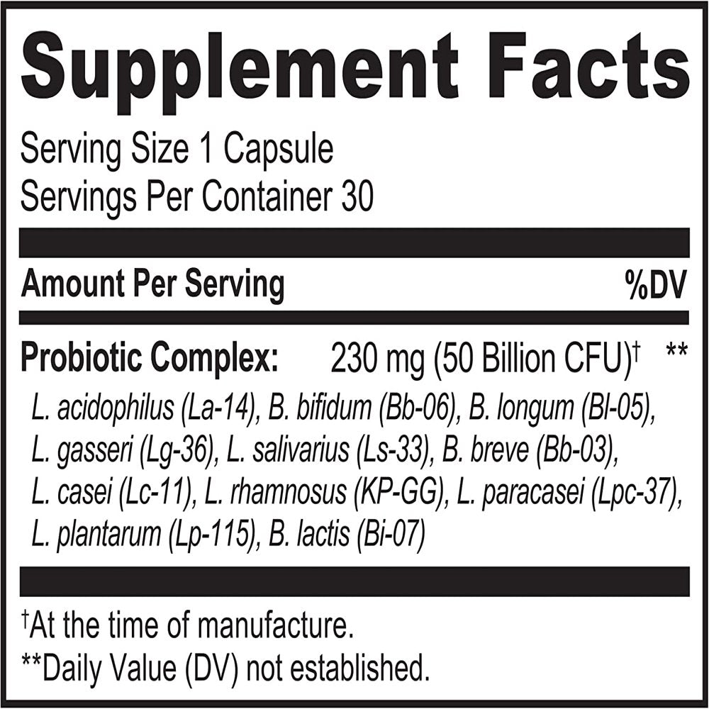 - Strong Support: Includes 11 research-backed probiotic strains with 50 Billion active cultures to help repopulate your gut with friendly bacteria. Lactobacillus and Bifidobacterium strains including: L. Acidophilus, L. Plantarum, L. Rhamnosus, L. Paracasei, L. Salivarius, L. Casei, L. Gasseri, B. Longum, B. Lactis, B. Breve, B. Bifidum.
