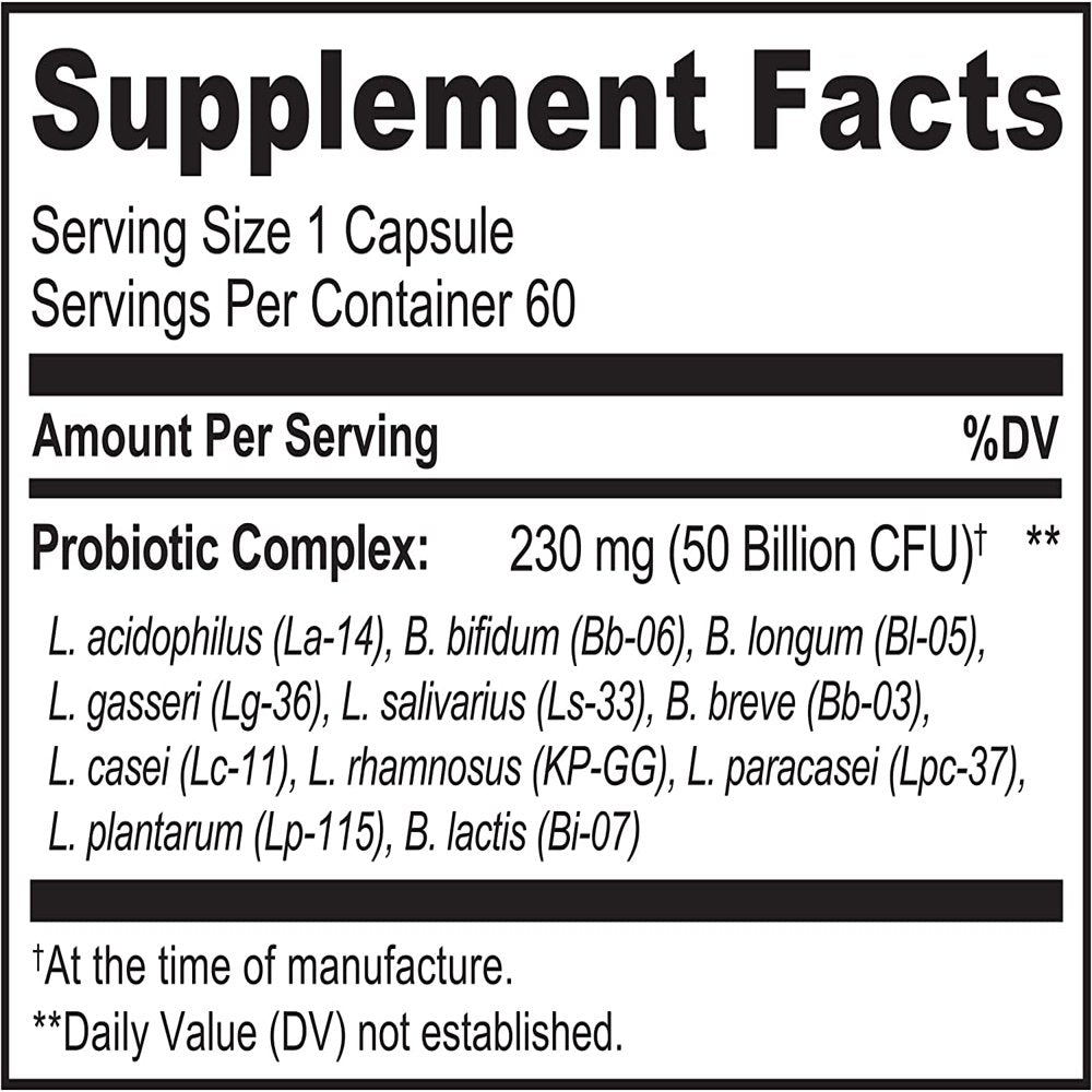 - Strong Support: Includes 11 research-backed probiotic strains with 50 Billion active cultures to help repopulate your gut with friendly bacteria. Lactobacillus and Bifidobacterium strains including: L. Acidophilus, L. Plantarum, L. Rhamnosus, L. Paracasei, L. Salivarius, L. Casei, L. Gasseri, B. Longum, B. Lactis, B. Breve, B. Bifidum.