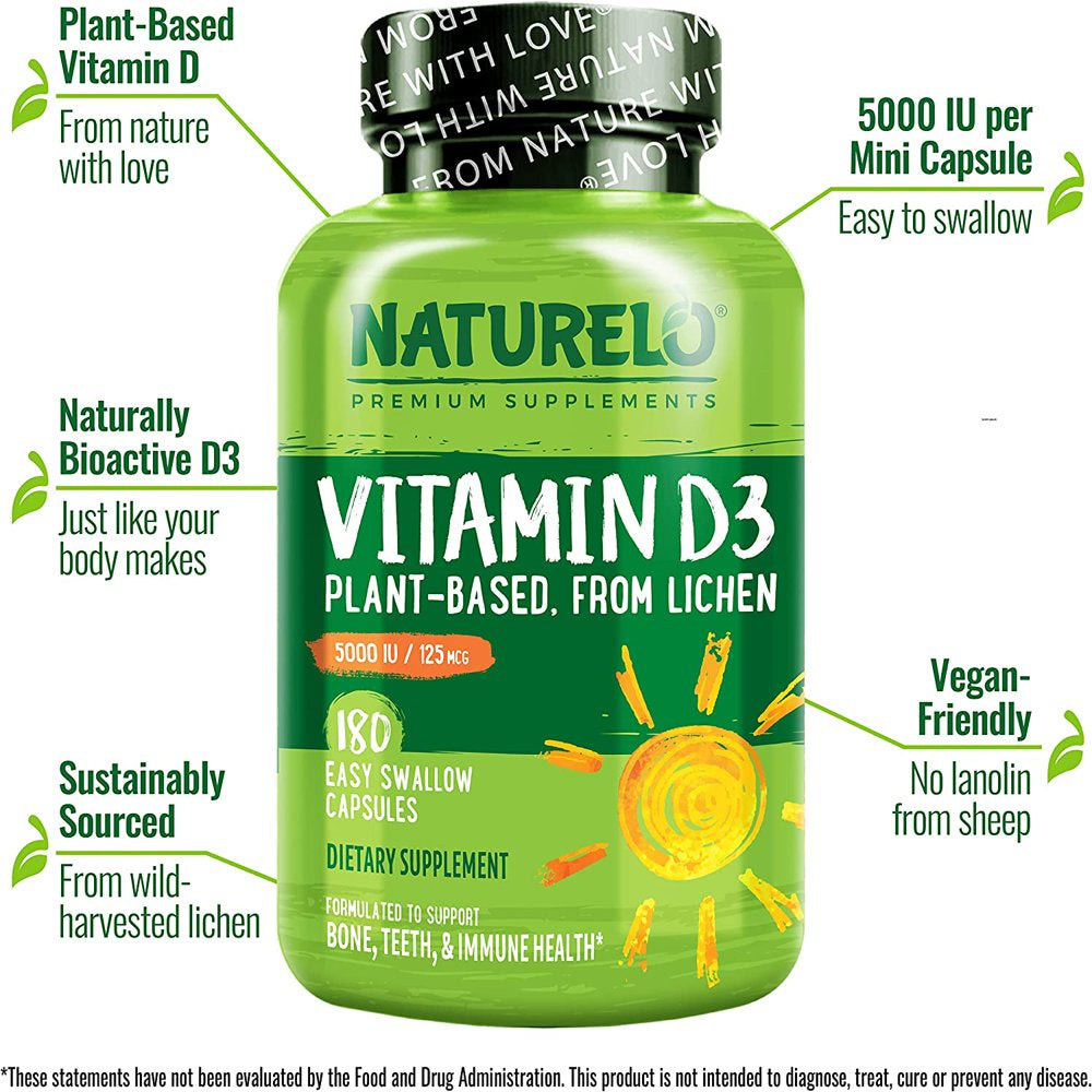 NATURELO Vitamin D3 - 5000 IU - Plant Based from Lichen - Natural Vegan D3 Supplement for Immune System, Bone Support, Joint Health - High Potency - Non-Gmo - Gluten Free - 180 Capsules - 5000 Iu is backordered and will ship as soon as it is back in stock.