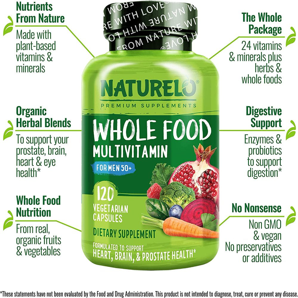NATURELO Whole Food Multivitamin for Men 50+ - with Vitamins, Minerals, Organic Herbal Extracts - Vegan Vegetarian - for Energy, Brain, Heart and Eye Health - 120 Capsules