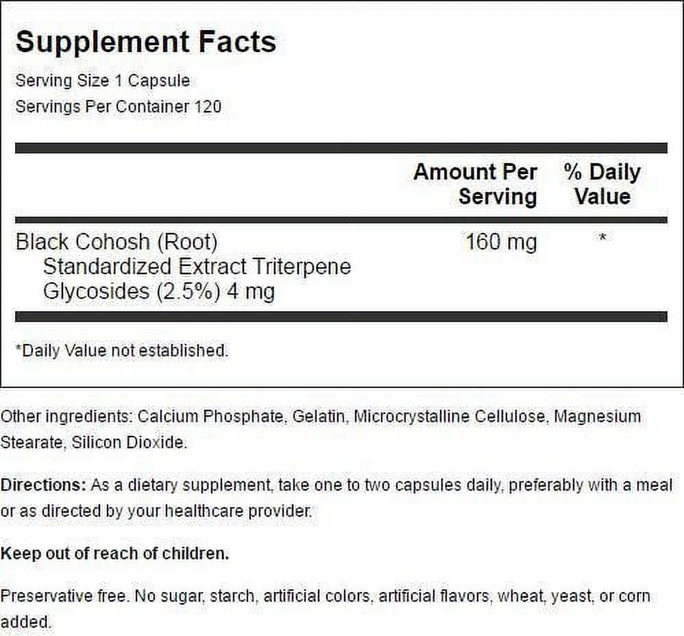 Black Cohosh Standardized Extract from Nature's Blend delivers 160 mg per capsule. Guaranteed release. Preservative free. No sugar, starch, salt, artificial colors, artificial flavors, wheat, yeast or corn added.