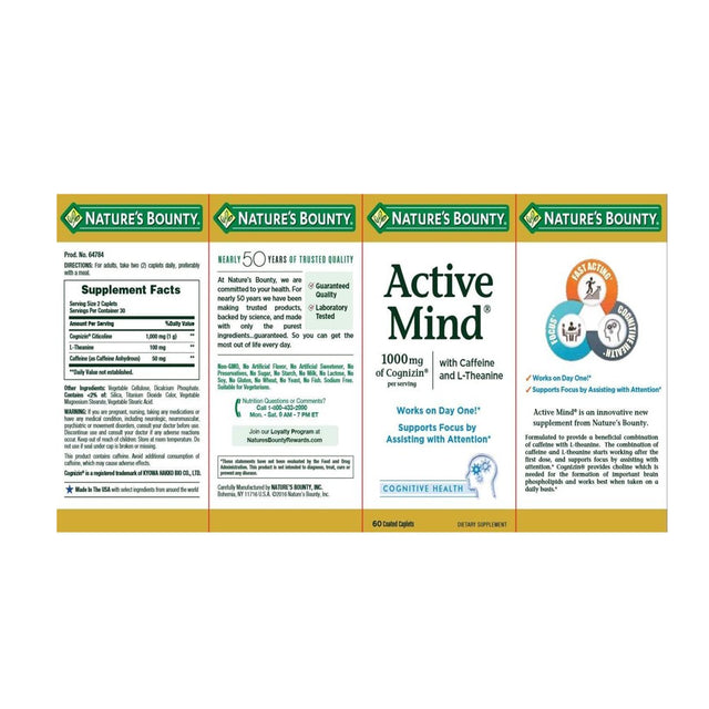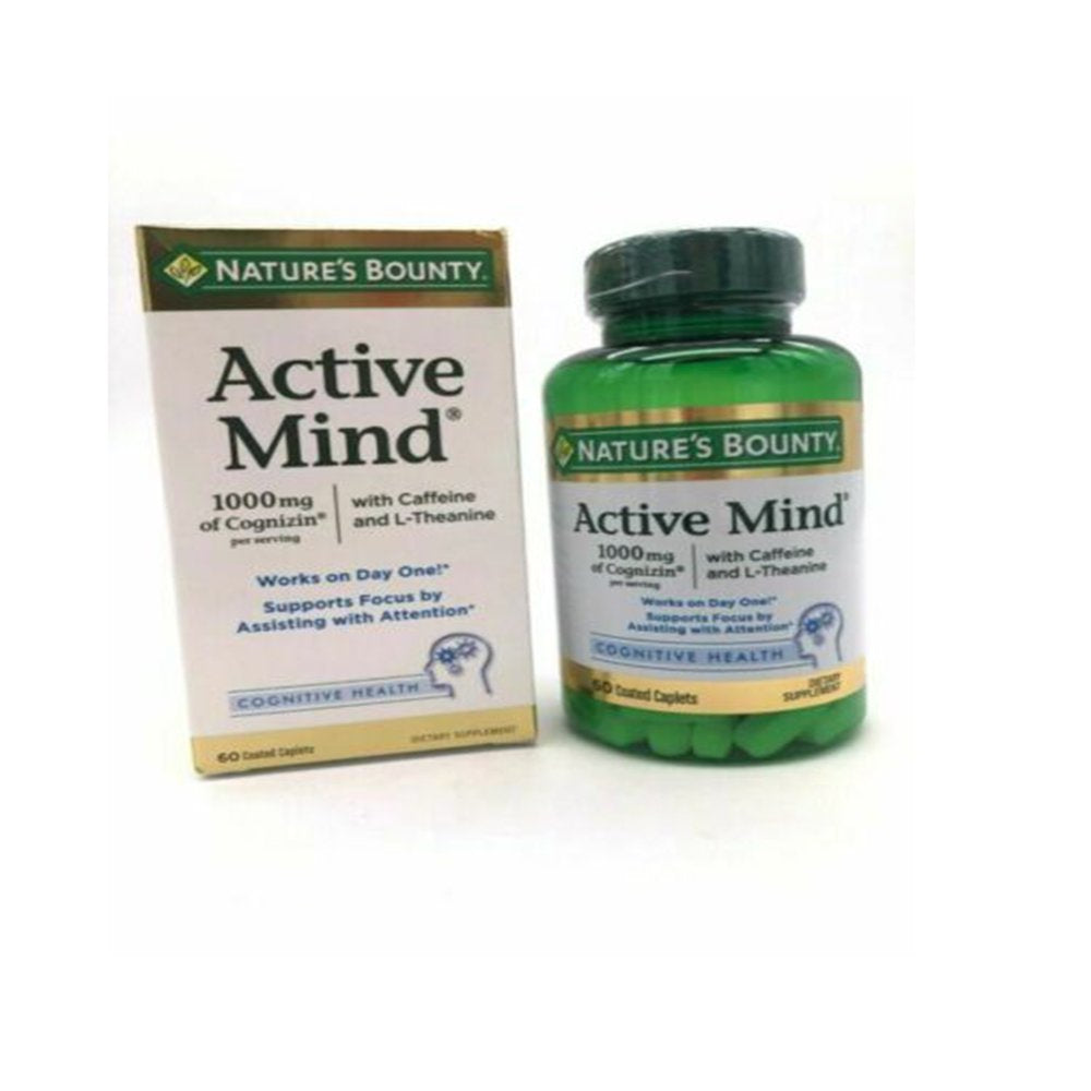 - Pack of 3 for the UPC: 074312647840 Active Mind is a revolutionary new supplement from Natureâs Bounty. Specially formulated with a blend of three ingredients which work synergistically. The combination of caffeine with theanine starts working after the first dose, and supports mental clarity by assisting with attention, in about 60 minutes. Cognizin works best when taken on a regular basis, and provides choline which is needed for the formation of important brain phospholipids.
