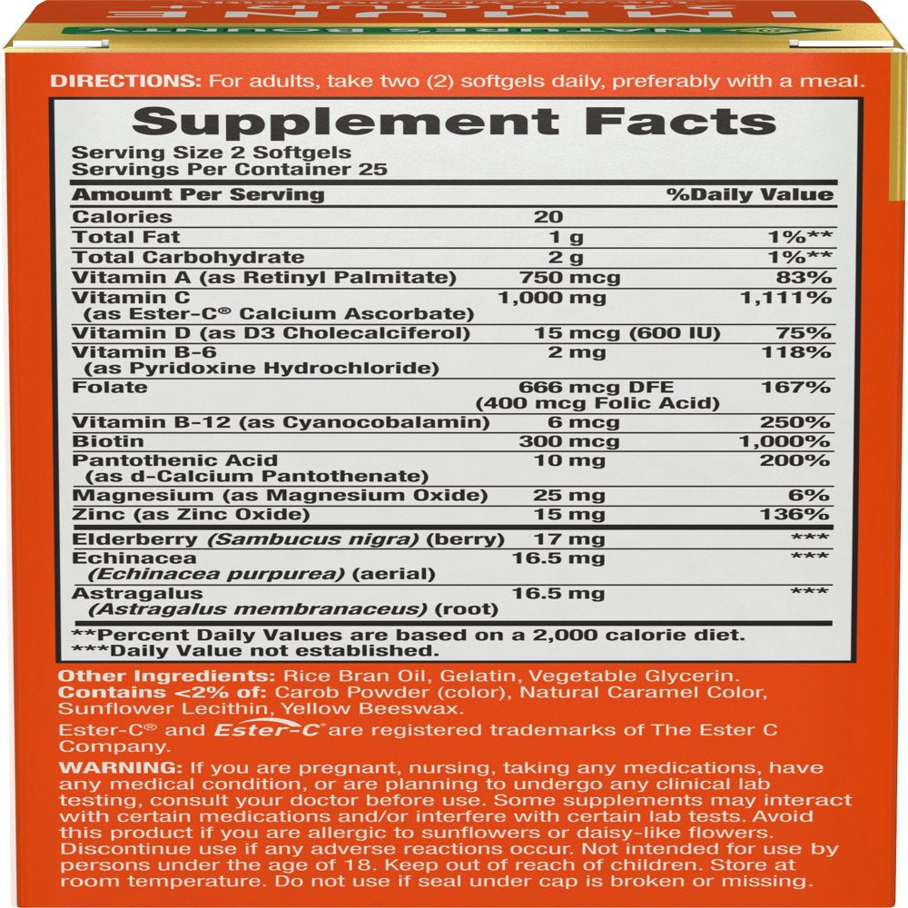 Nature's Bounty® Immune 24 Hour + with Ester-C ®Vitamin C provides advanced, long-lasting immune support to help keep you healthy.* With 1,000 mg of Ester-C®, the clinically studied immune supporting ingredient, is the only Vitamin C that stays in your white blood cells for up to 24 hours, providing immune support around the clock.* Highly bioavailable Ester-C® can increase Vitamin C levels in the body, which is important for white blood cell function, as white blood cells play a vital role in the immune system and contribute to the health of the upper respiratory tract.* For additional wellness benefits, Nature's Bounty® Immune 24 Hour + rapid release softgels contain Vitamin D, Vitamin A, plus Zinc for extra immune and antioxidant support.* In addition, the immune-supporting formula is Non-GMO, and free of artificial flavors, artificial sweeteners, sugar, starch, milk, lactose, soy, gluten, wheat, yeast, fish, and sodium. The Vitamin C 1000mg supplement also includes herbal ingredients Elderberry and Echinacea, plus 9 essential nutrients for your overall health.* *These statements have not been evaluated by the Food and Drug Administration. This product is not intended to diagnose, treat, cure or prevent any disease.