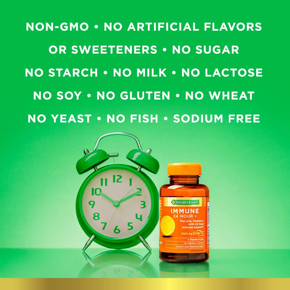 - NON-GMO FORMULA: Nature's Bounty® Immune 24 Hour + is Non-GMO and contains No artificial flavor or artificial sweeteners, no sugar, no starch, no milk, no lactose, no soy, no gluten, no wheat, no yeast, no fish, sodium free