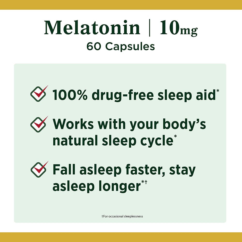 Natures Bounty Maximum Strength Melatonin 10Mg Capsules - 60 Ea, 2 Pack ; UPC: 074312194917. Nature’s Bounty Melatonin helps promote a tranquil sleep so you can awaken refreshed and revitalized. It’s a terrific choice if you experience occasional sleeplessness or jet lag, or if you want to improve your quality of rest. Melatonin helps you fall asleep faster and stay asleep longer. Nature's Bounty Melatonin, a hormone naturally produced in the body that is closely involved in the natural sleep cycle. Sometimes it’s hard to unwind after a long day. Dietary Supplements.