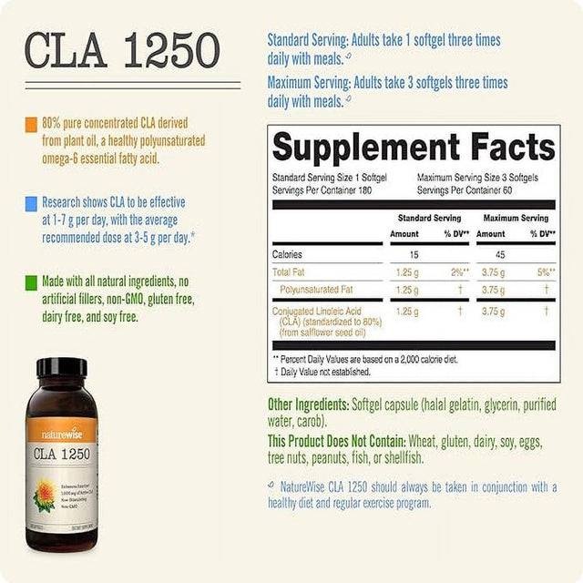 - HIGH QUALITY & POTENCY: NatureWise CLA 1250 comes from pure, premium quality safflower oil from certified sources, standardized to 80% potency.