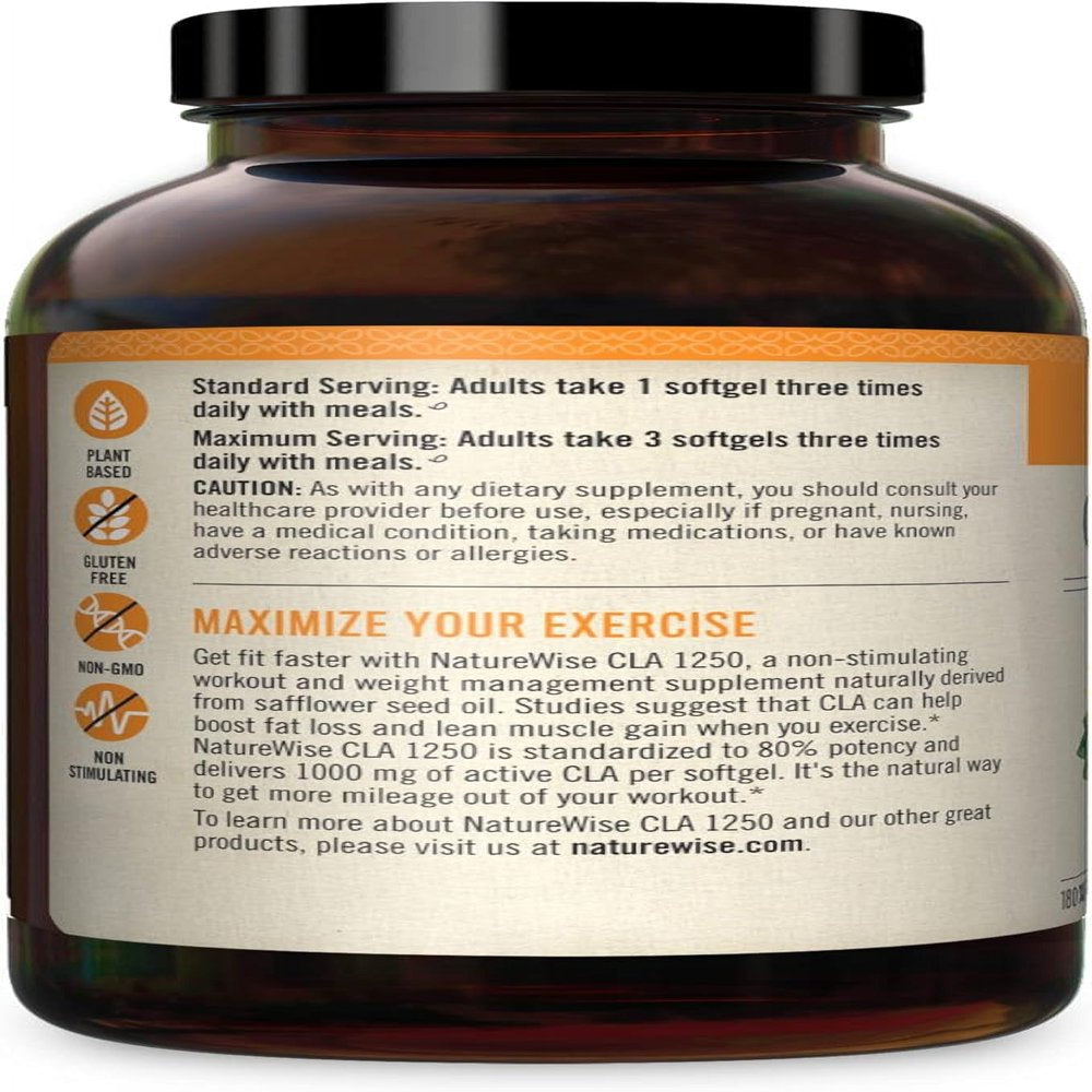 Maximize your exercise results with NatureWise CLA 1250, a natural, non-stimulating workout and weight management supplement derived from safflower oil. Studies suggest that adding CLA to your fitness program may help you lose body fat while maintaining lean muscle gain.* It is thought to work by inhibiting the body?s fat storage mechanism, which encourages the body to burn fatty acids for energy, sparing the breakdown of muscle for fuel.*