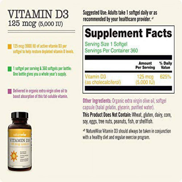 Naturewise Vitamin D3 5000Iu (125 Mcg) 1 Year Supply for Healthy Muscle Function, and Immune Support, Non-Gmo, Gluten Free in Cold-Pressed Olive Oil, Packaging Vary ( Mini Softgel), 360 Count
