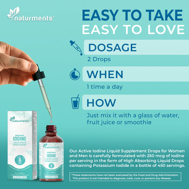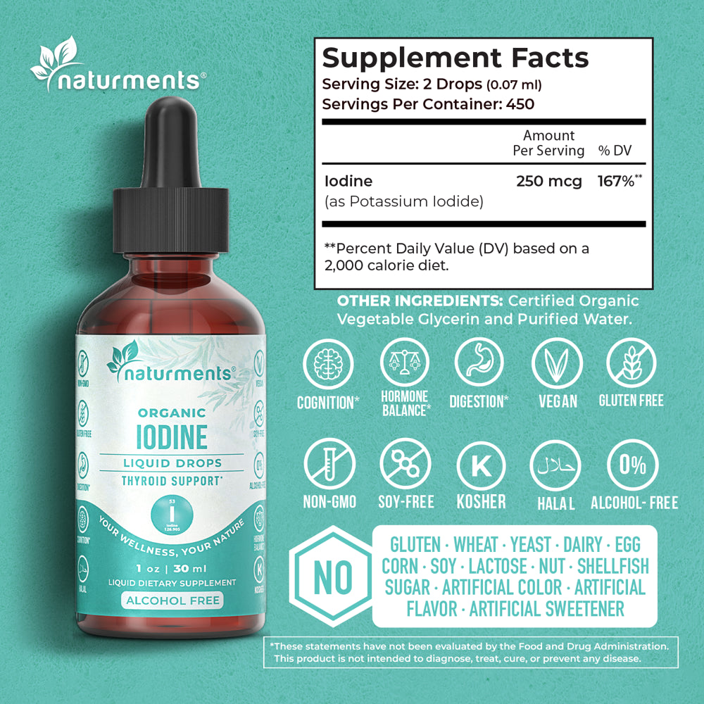 Taking Iodine has never been easier! Just stir 2 drops of our Liquid Iodine into a glass of water. Naturments Organic Iodine Liquid Drops is a USA-made dietary supplement and is Non-GMO gluten soy and alcohol-free. Our formula is also Halal, Kosher and vegan-friendly