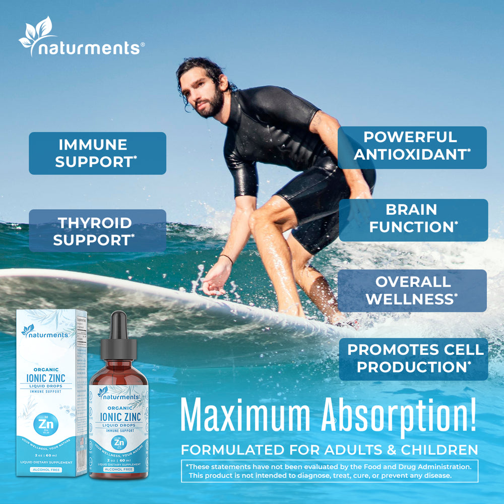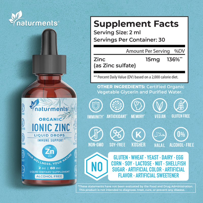 Naturments Zinc Liquid Drops Supplement: Immune Support - Maximum Strength Pure Organic Ionic Liquid Zinc Sulfate for Adults & Kids - Brain and Thyroid Support - Vegan, Non-Gmo, Gluten Free - 2 Oz