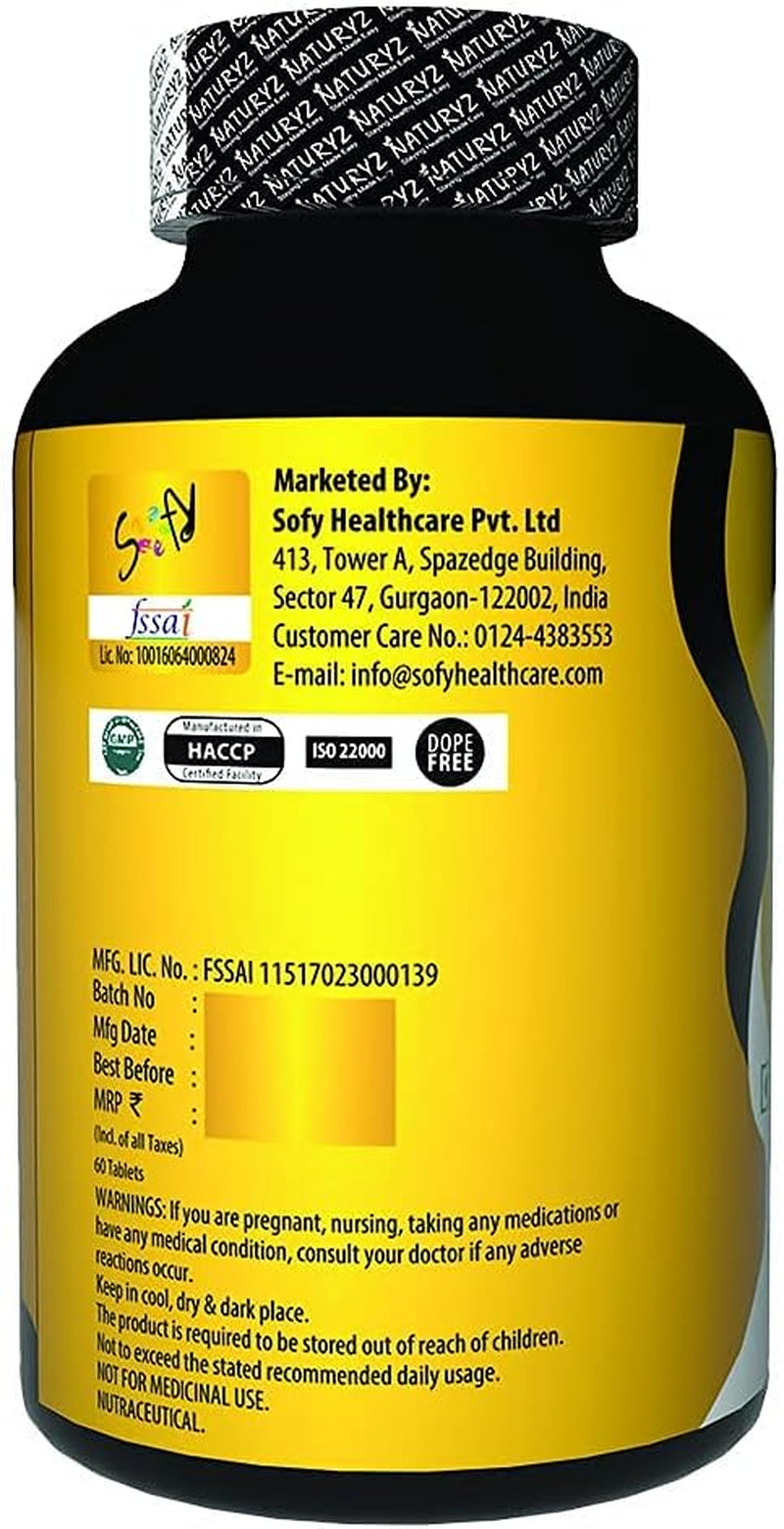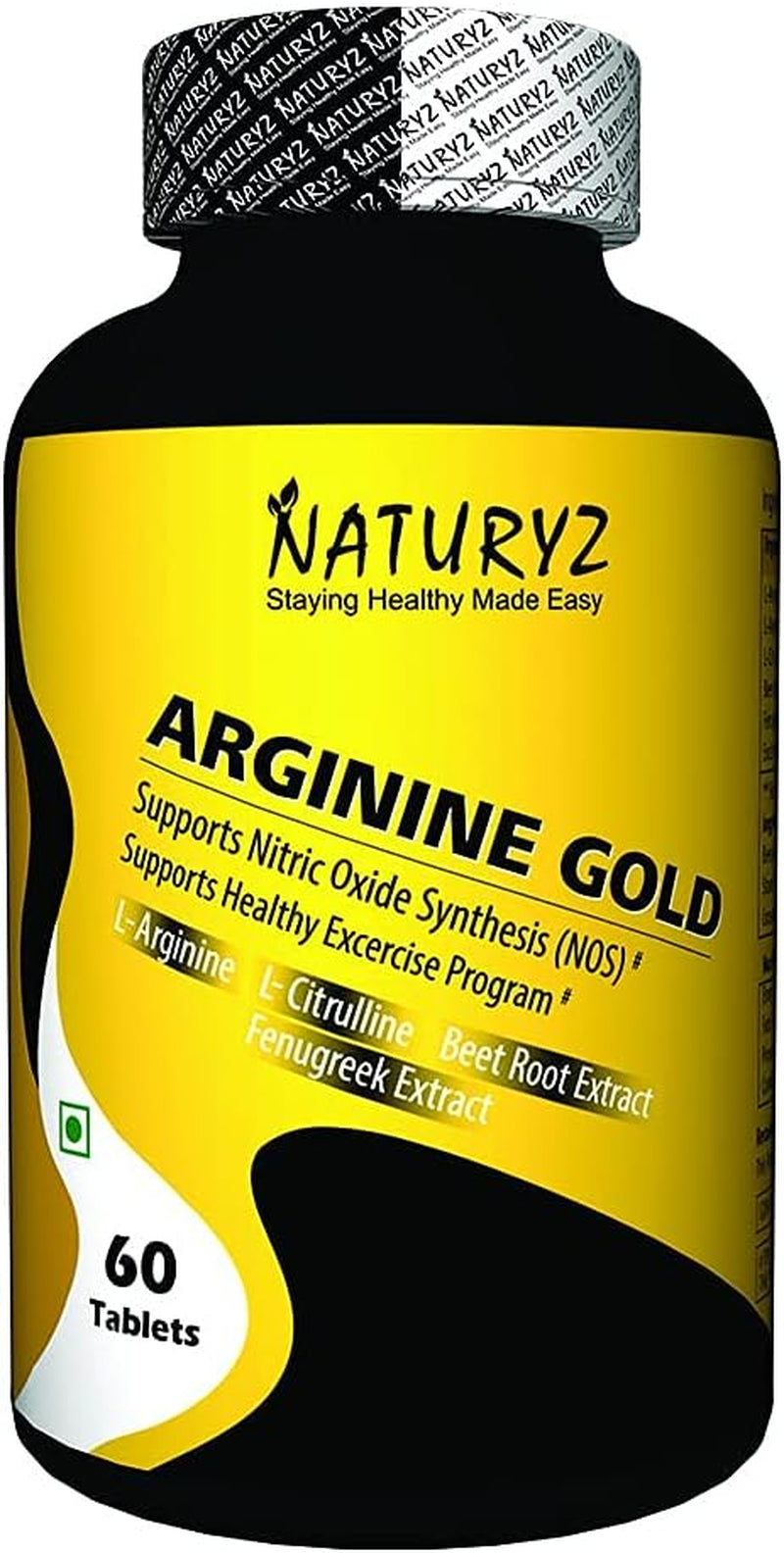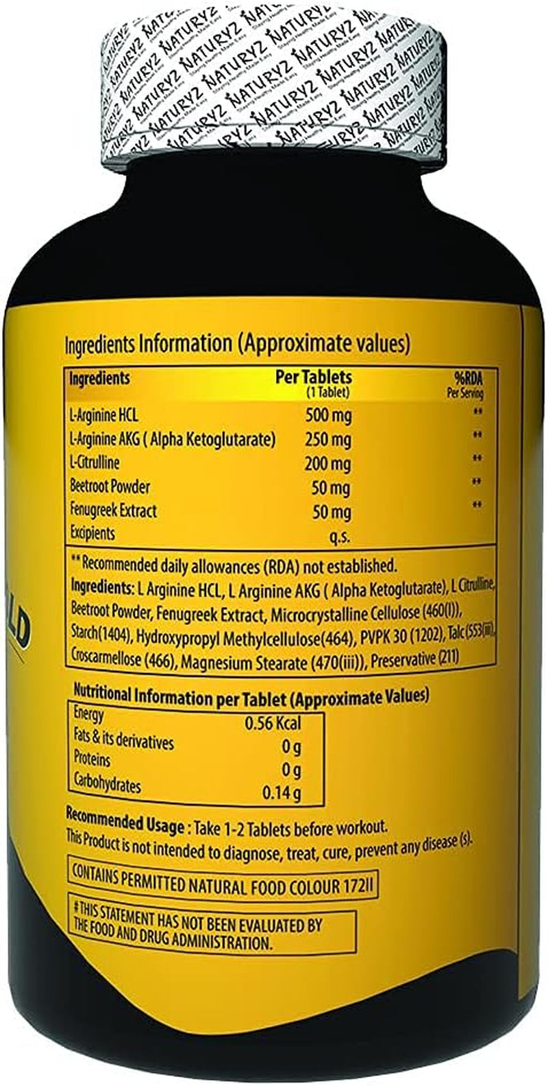 Naturyz Arginine Gold Pre-Workout Tablets with 1500Mg L- Arginine, 400Mg Citrulline, Beetroot Powder & Fenugreek Extract per Serving - 60 Tablets