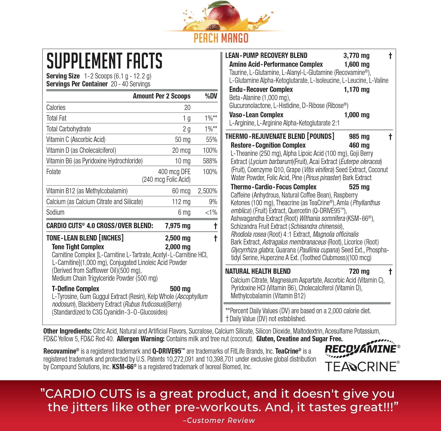 Cardio Cuts includes a strong blend of energy-rich and patented ingredients, specifically 300mg of Caffeine, plus TeaCrine, Quercetin (QU995), Ashwagandha (KSM-66), and 100mg of Raspberry Ketones per its 2-scoop serving, to help maximize your energy levels, mental focus, and boost your metabolism.