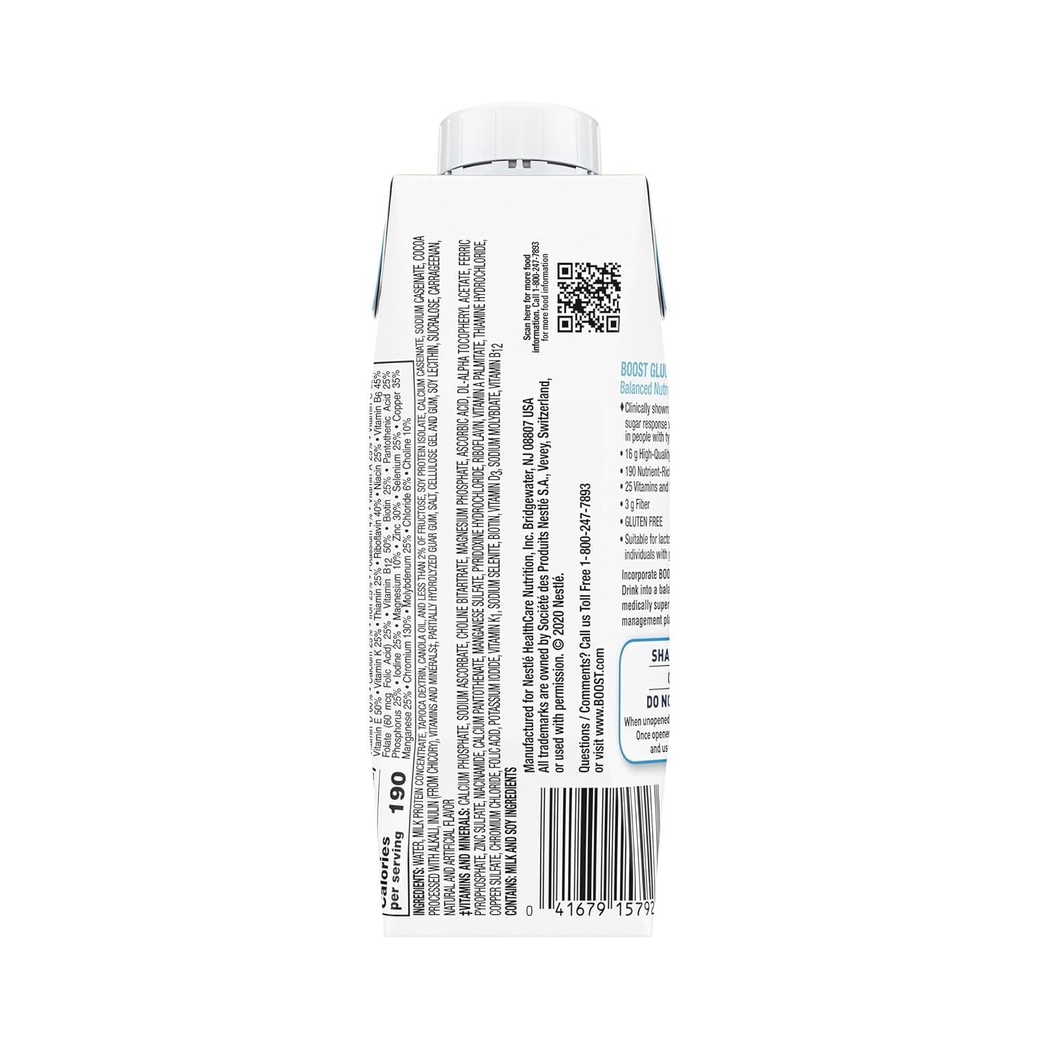 Boost Glucose Control is a balanced nutritional drink specially formulated for people with diabetes. It provides a balance of protein, carbohydrates and fat which are designed to help manage blood glucose levels as part of a balanced diet with just 1 Carb Choice per 8 fl oz container. Convenient reclosable cap - after opening, can easily replace cap on container to store remaining formula in the refrigerator for up to 24 hours. Boost Glucose Control is intended for use under medical supervision as part of a diabetes management plan. Suitable for people with gluten sensitivity or celiac disease and is suitable for lactose intolerance (not for individuals with galactosemia).