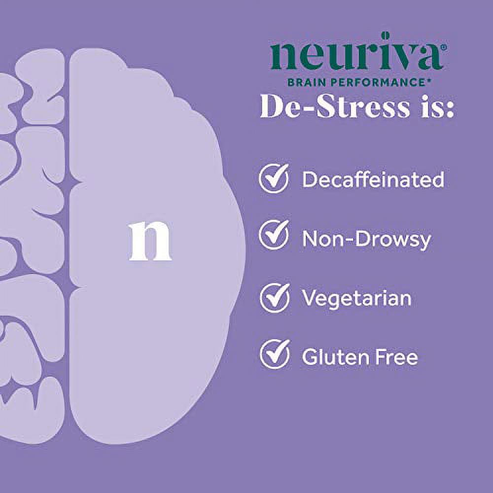 - FUELS BRAIN HEALTH IN 5 WAYS: Neuriva De-Stress fuel brain health in 5 ways: everyday stress reduction, relaxation, focus, accuracy and concentration. Neuriva De-Stress is also decaffeinated, vegetarian, non-drowsy and gluten-free.