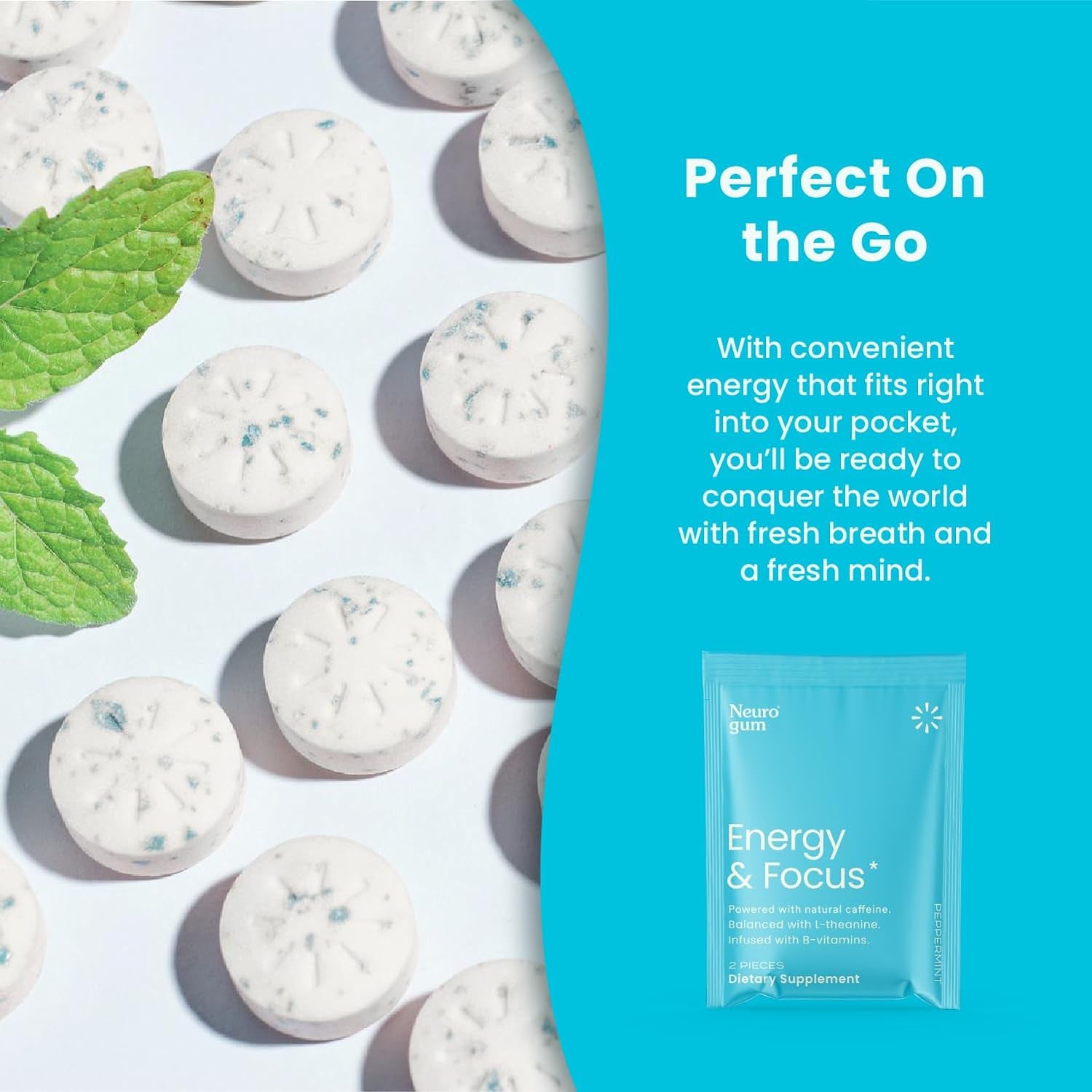 Neurogum Energy Caffeine Gum (60 Pieces) - Sugar Free with L-Theanine + Natural Caffeine + Vitamin B12 & B6 - Nootropic Energy & Focus Supplement for Women & Men - Keto & Vegan, Peppermint Flavor