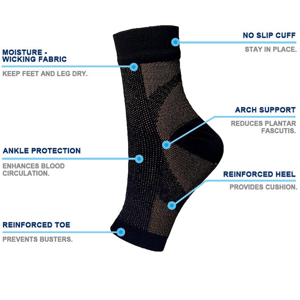 - 1. RELIEVE FOOT PAIN: Our Compression stocking use compression to apply pressure to the center of your feet, stimulating blood flow to ease pain, If you suffer from neuropathy, tendonitis, plantar fasciitis, or diabetic foot pain, stiffness or soreness in their feet, Also, for anyone with swollen feet or bad blood circulation, Ankle brace socks neuropathy socks can help soothe symptoms.