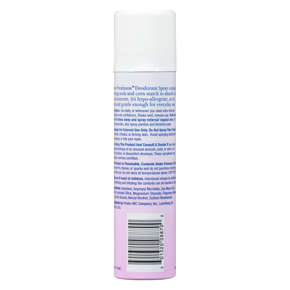 You can head out the door with confidence using the 2 oz can of New Freshness Feminine Deodorant Spray. This deodorant spray contains natural odor- and moisture-absorbing ingredients like baking soda and corn starch. Combined, they effectively eliminate the presence of foul smells, leaving you feeling fresh. This hypoallergenic deodorant contains a gentle formula that's safe for daily use, allowing you to spray it on freely throughout the day. Apply it after a bath or shower for all-day control and add a few sprays to undergarments or feminine pads for extra protection. This 2 oz New Freshness Feminine Deodorant Spray comes in a portable size, enabling you to pack it up in a tote, duffel or suitcase so it's on hand and ready for use. New Freshness is also available in a Vinegar & Water Douche form, providing ready-to-use gentle cleansing that won't cause irritation. New Freshness is the trusted brand for safe and gentle feminine freshness!
