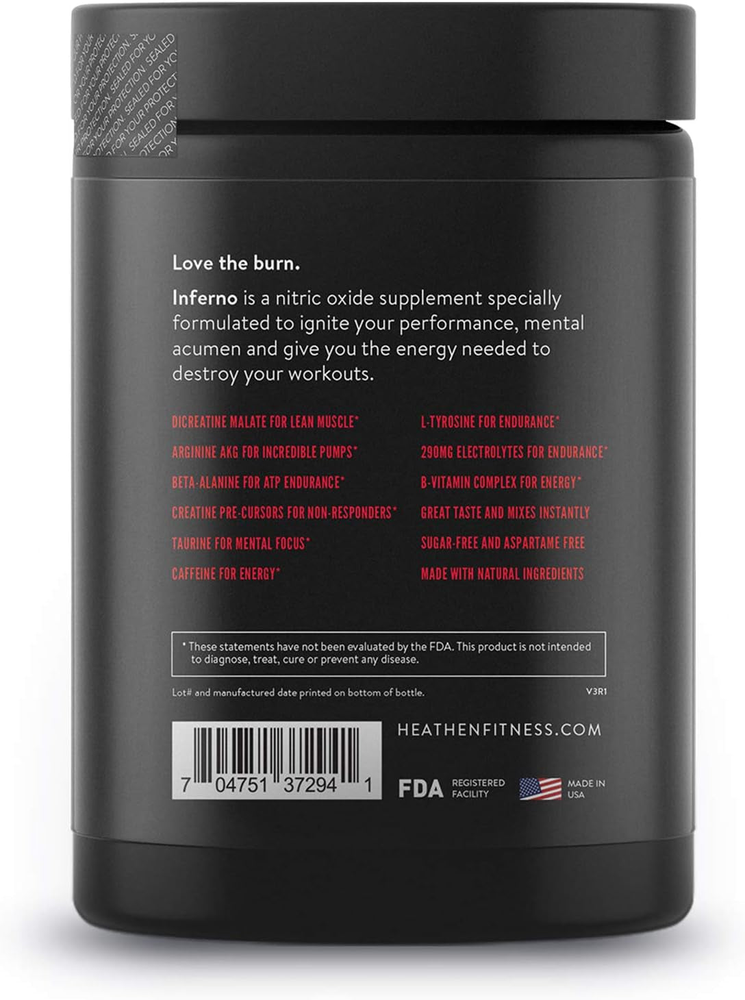 Inferno is a nitric oxide supplement specially formulated to ignite your performance, mental acumen and give you the energy needed to destroy your workouts. Sugar-free and aspartame free. Made with natural ingredients