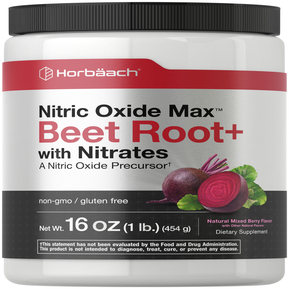 Boost your daily routine with Horbaach’s Nitric Oxide Max Beet Root Powder! Our vegan formula provides 7,100 mg of a Nitric Oxide Precursor Blend which includes Organic Beet Root, Grape Seed, Organic Pomegranate, Organic Spinach, and Black Pepper Extract. Our powder also features Vitamin C, Niacin, Vitamin B-12, and other key nutrients for additional daily support. Simply mix our natural mixed berry flavored powder with water and enjoy!