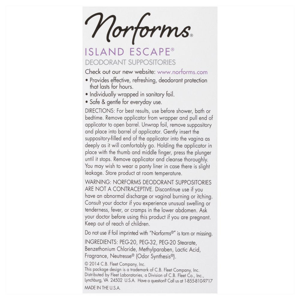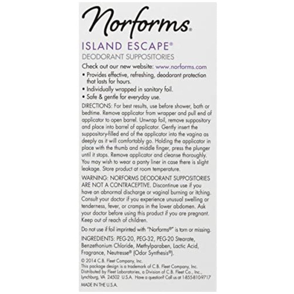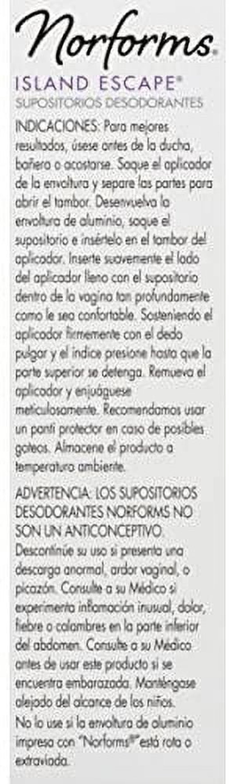 Norforms Feminine Deodorant Suppositories provide effective, refreshing protection that lasts for hours. They're individually wrapped in sanitary foil and are gentle for everyday use. Each box contains 12 Norform suppositories that help combat odor internally and safely with an applicator for easy insertion. They're pH balanced and hypoallergenic and have a tropical plumeria fragrance. This product is dermatologist and gynecologist tested. Norforms are your secret weapon for odor control. This effective long-lasting odor control comes in 2 scents. Island Escape is a luxurious plumeria fragrance with a tropical flair, while Tropical Splash is as fresh as a light tropical rain shower. Norforms Feminine Deodorant Suppositories, Island Escape, 12 Count