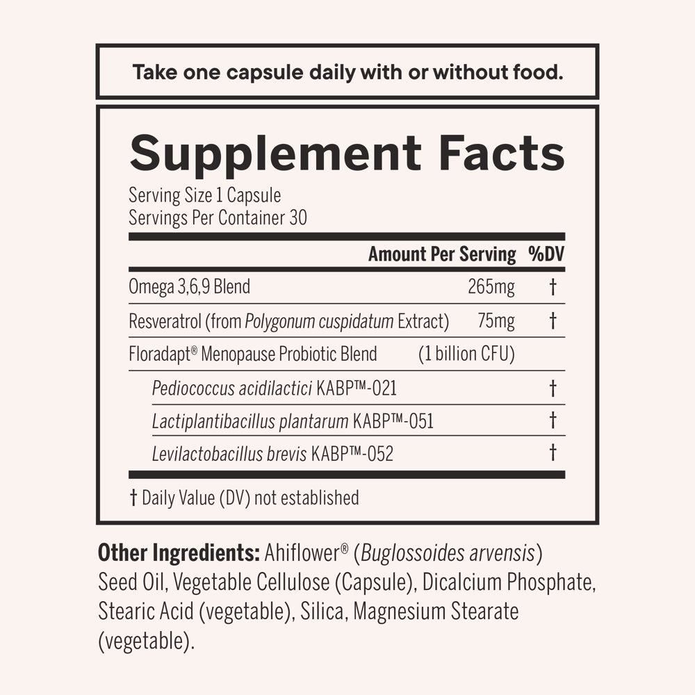 Nouri Menopause Health Probiotic with Omega and Resveratrol Vegan Capsules, 30 Day Supply