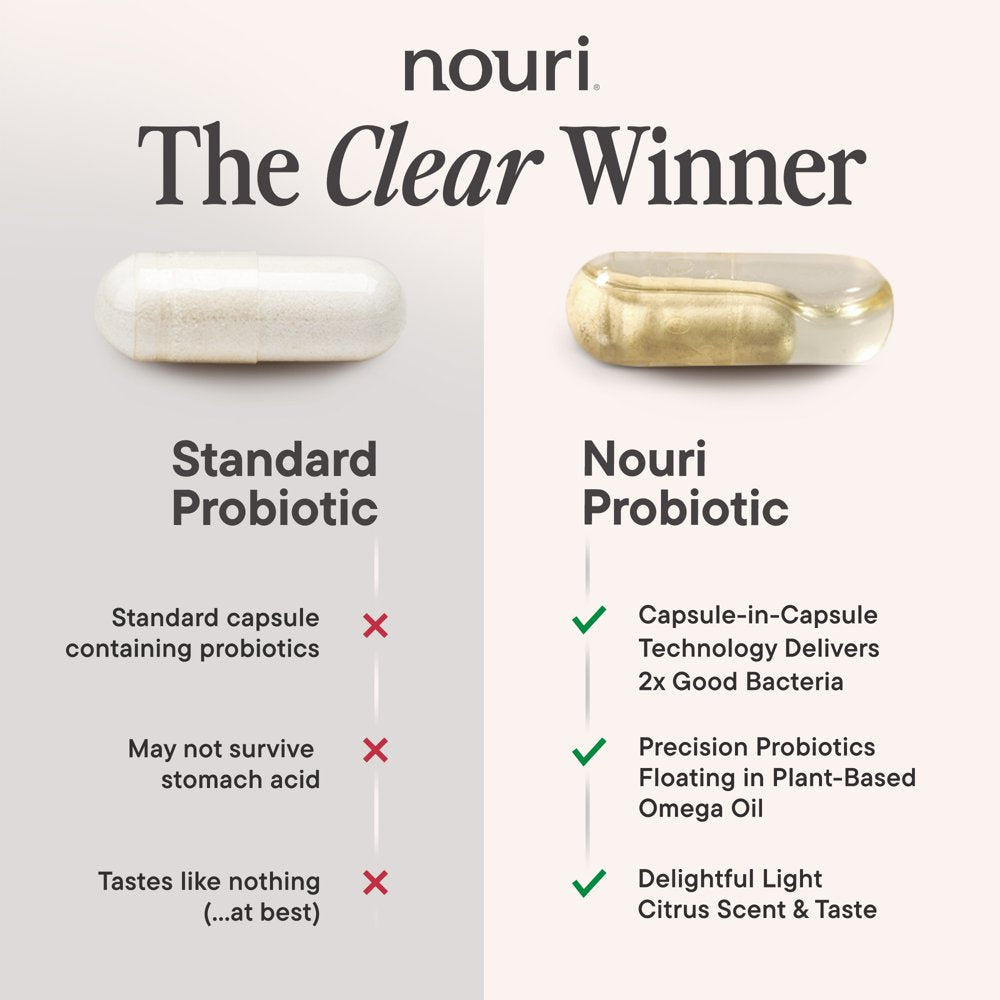 Experience relief from pre-menopausal, menopausal, and post-menopausal discomforts with Nouri Menopause Health Probiotic. This unique formula features three diverse probiotic strains, resveratrol, and plant-based omega oil, all in a convenient, easy-to-take vegan capsule with a sweet citrus scent. With a 30-day supply, you can trust that Nouri Menopause Health Probiotic will provide the comprehensive support you need to feel your best during all stages of menopause. Try a new approach for hormone balance for females through the microbiome. By feeding the gut brain axis, Menopause Health uses probiotics to support estrogen metabolism and a reduction of hot flashes and night sweats. No artificial estrogen, no black cohosh.